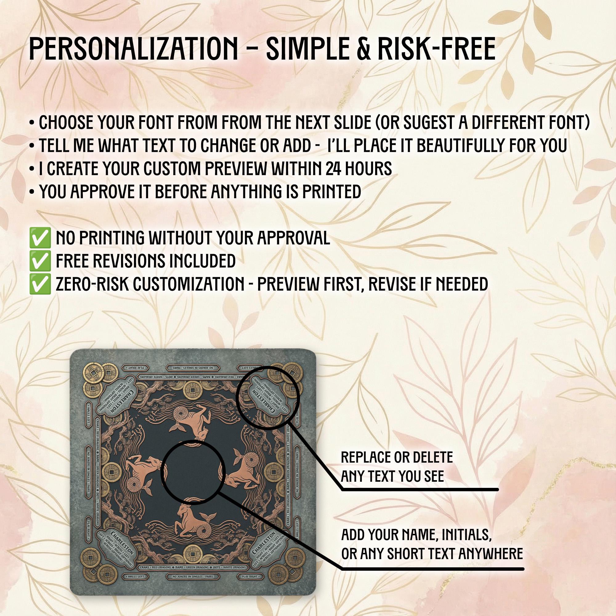 Our shop is dedicated to creating thoughtful, high-quality accessories that enhance your gaming moments. Each personalized Mahjong mat is carefully crafted with attention to detail and shipped promptly to bring joy to your game nights and special occasions.