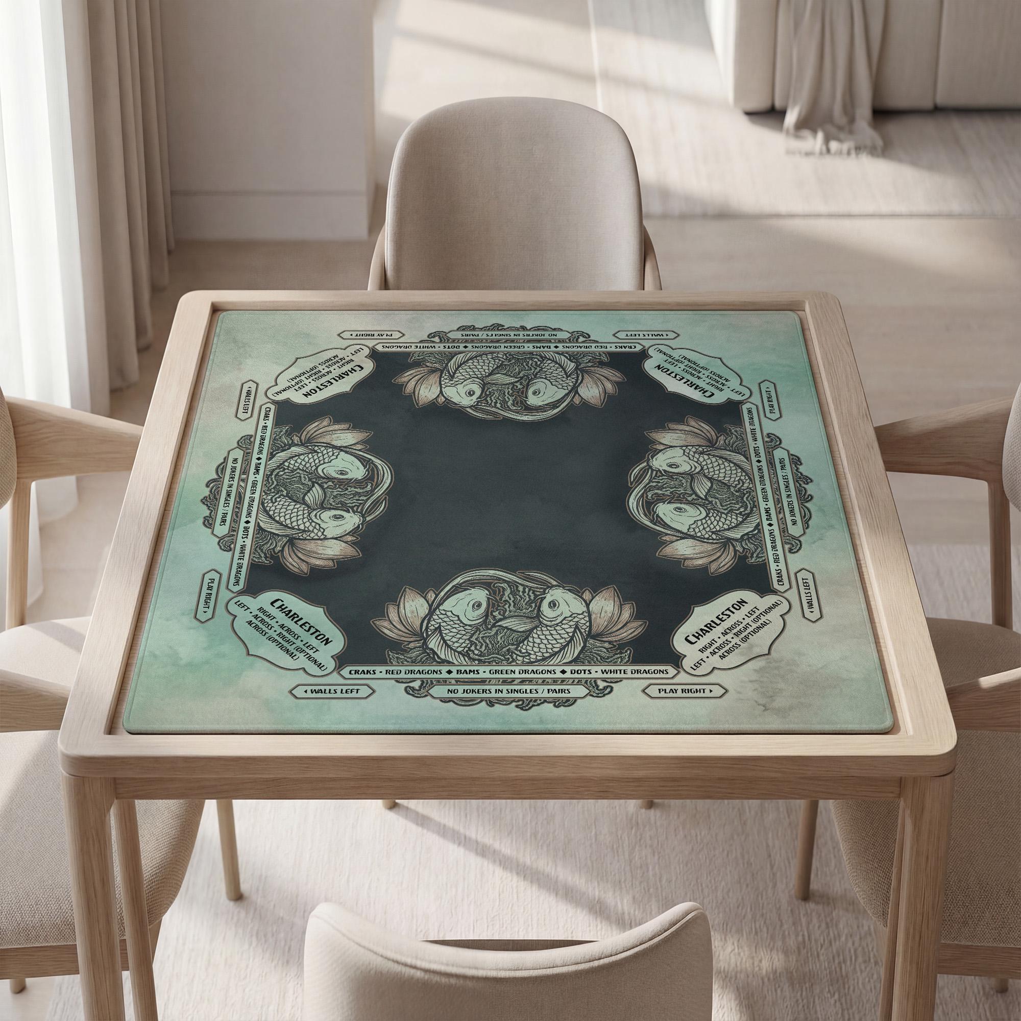 This premium Mahjong mat features an elegant Pisces koi fish design in a vintage teal palette, allowing for full personalization of text and fonts. Crafted with noise-reducing technology and a waterproof surface, this non-slip mat ensures a focused and stylish gaming experience for any astrology lover.