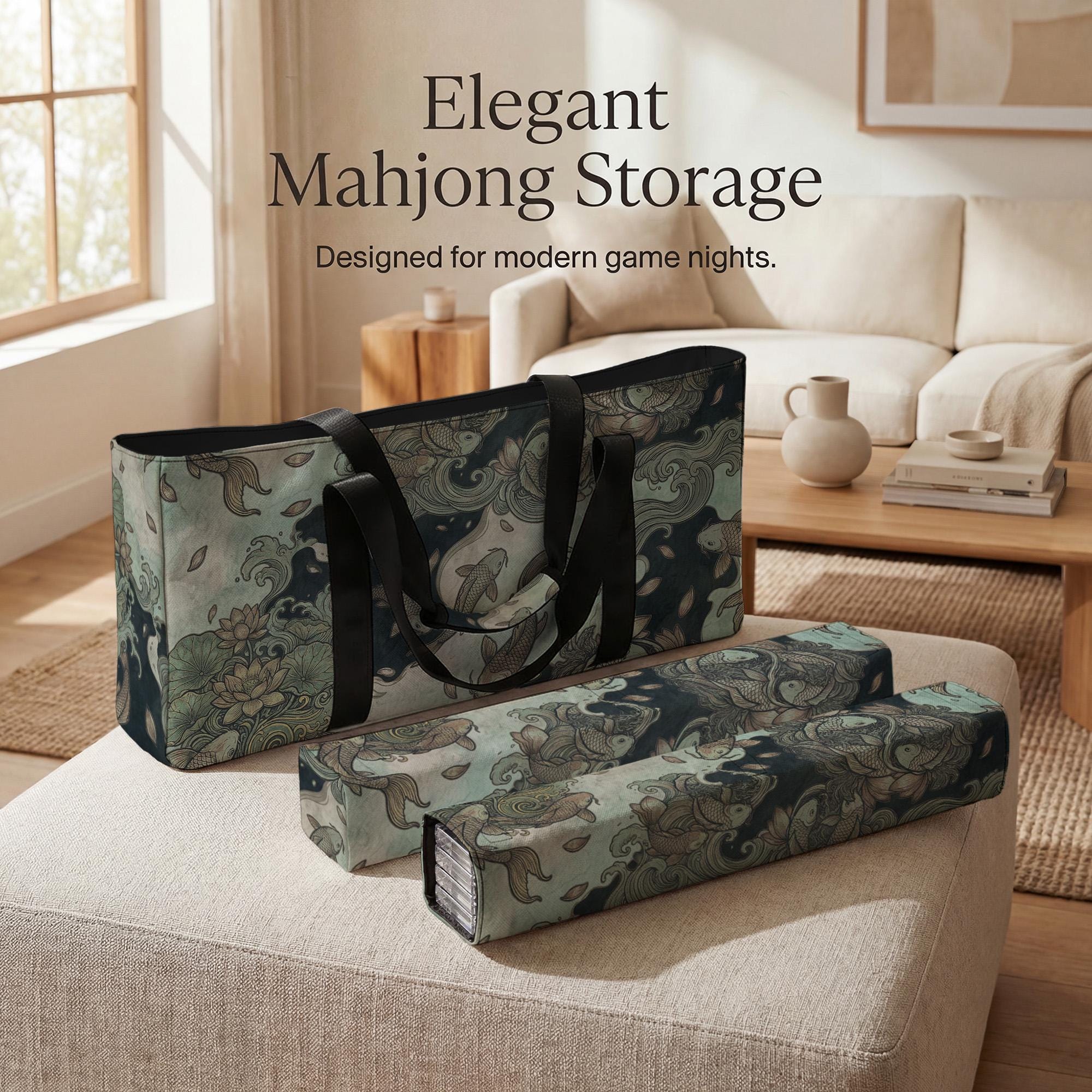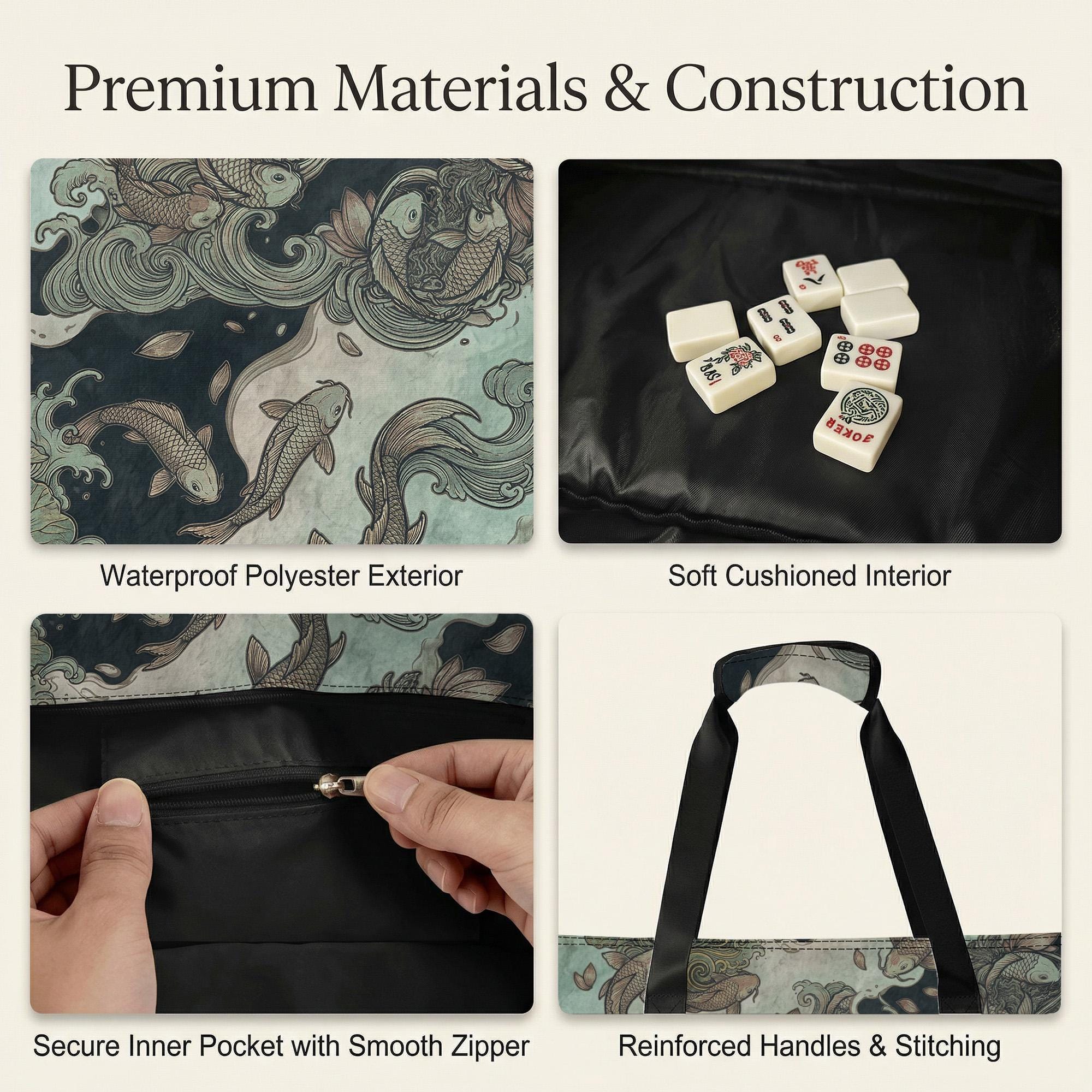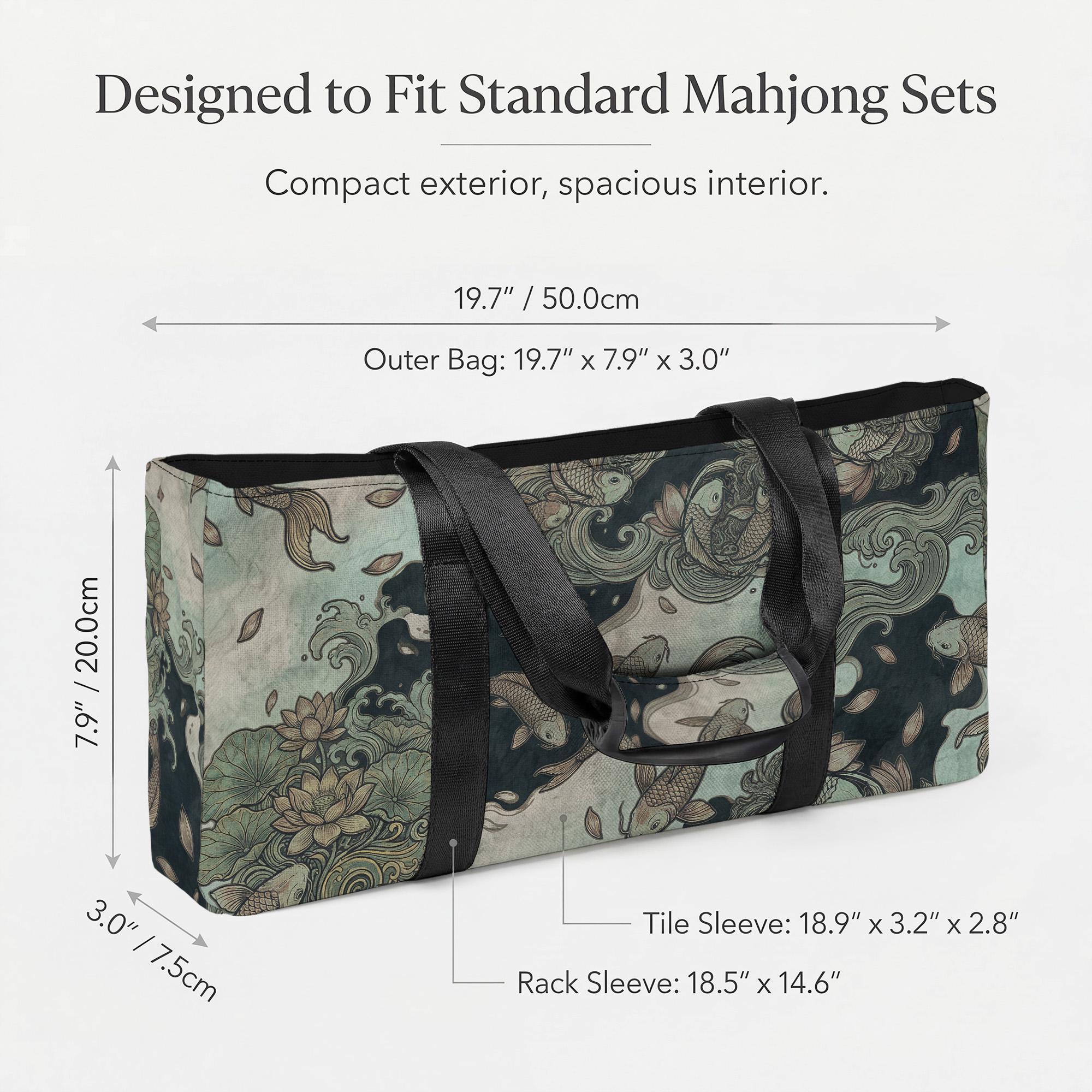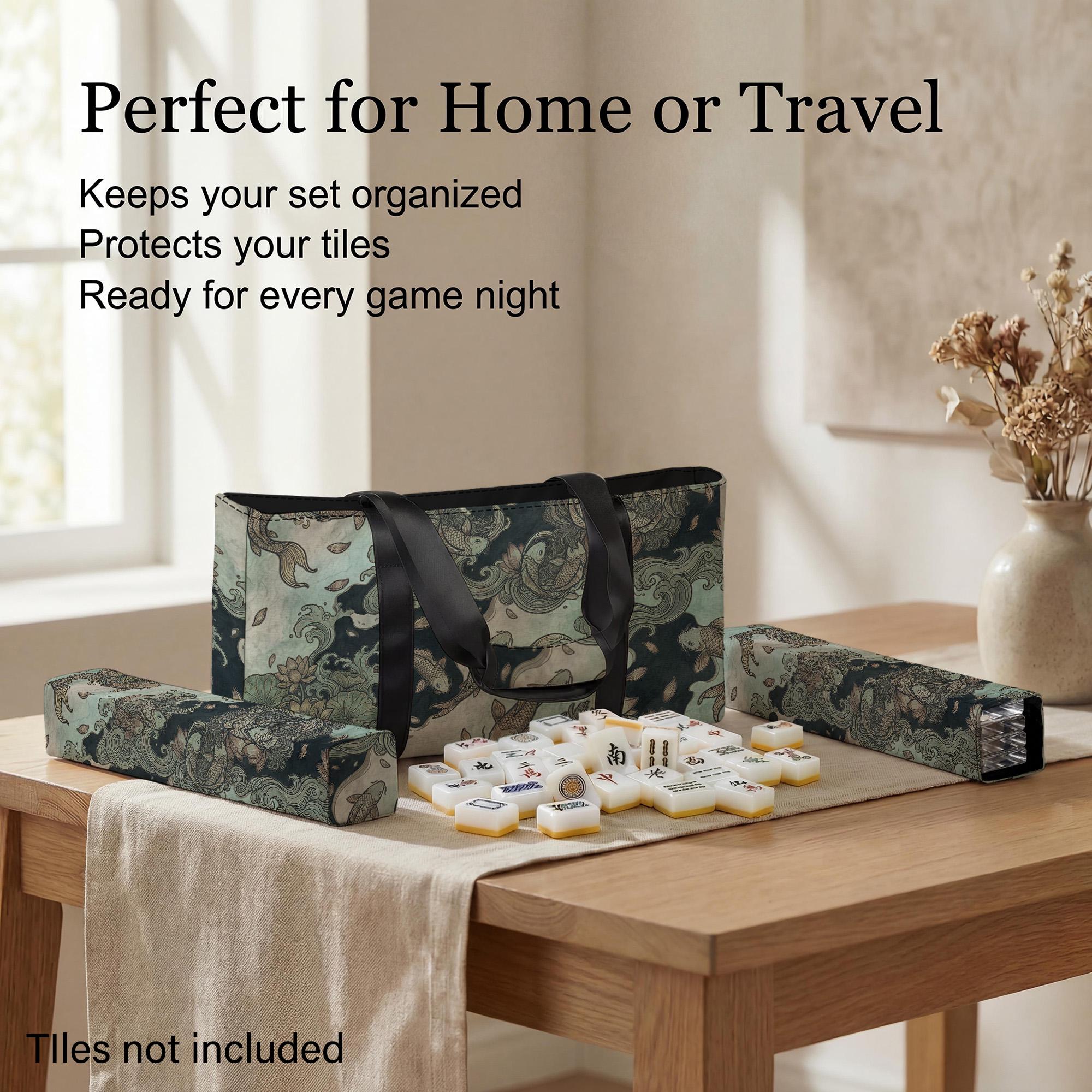 Discover the perfect blend of elegance and practicality with this Pisces Mahjong storage bag, designed to elevate your game night experience. Featuring a stunning koi fish storage motif in teal and gold, this waterproof travel case is crafted to protect and organize your tiles with style. Whether you're heading to a Mahjong club or enjoying a casual game at home, this ornate organizer keeps your set ready and beautifully contained.