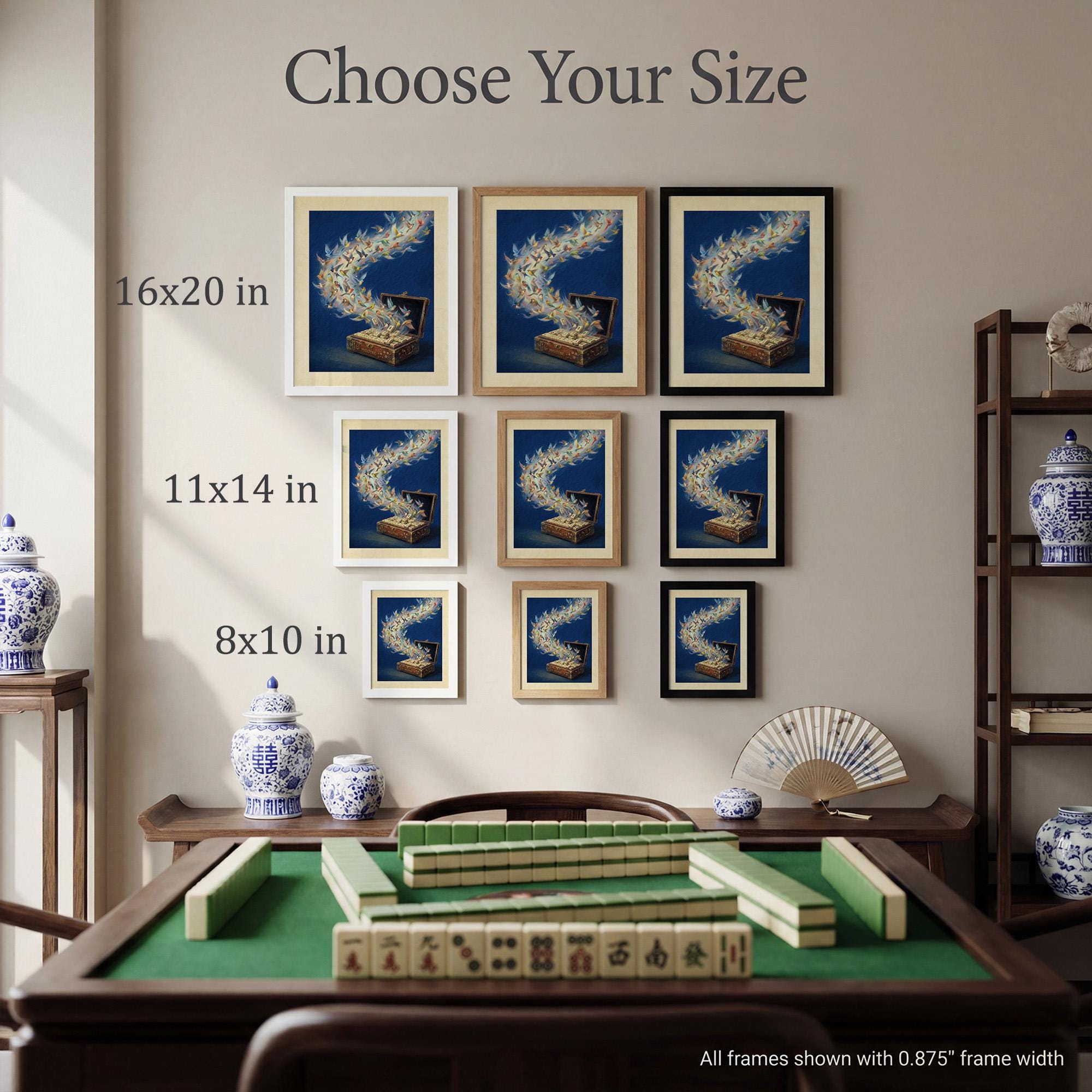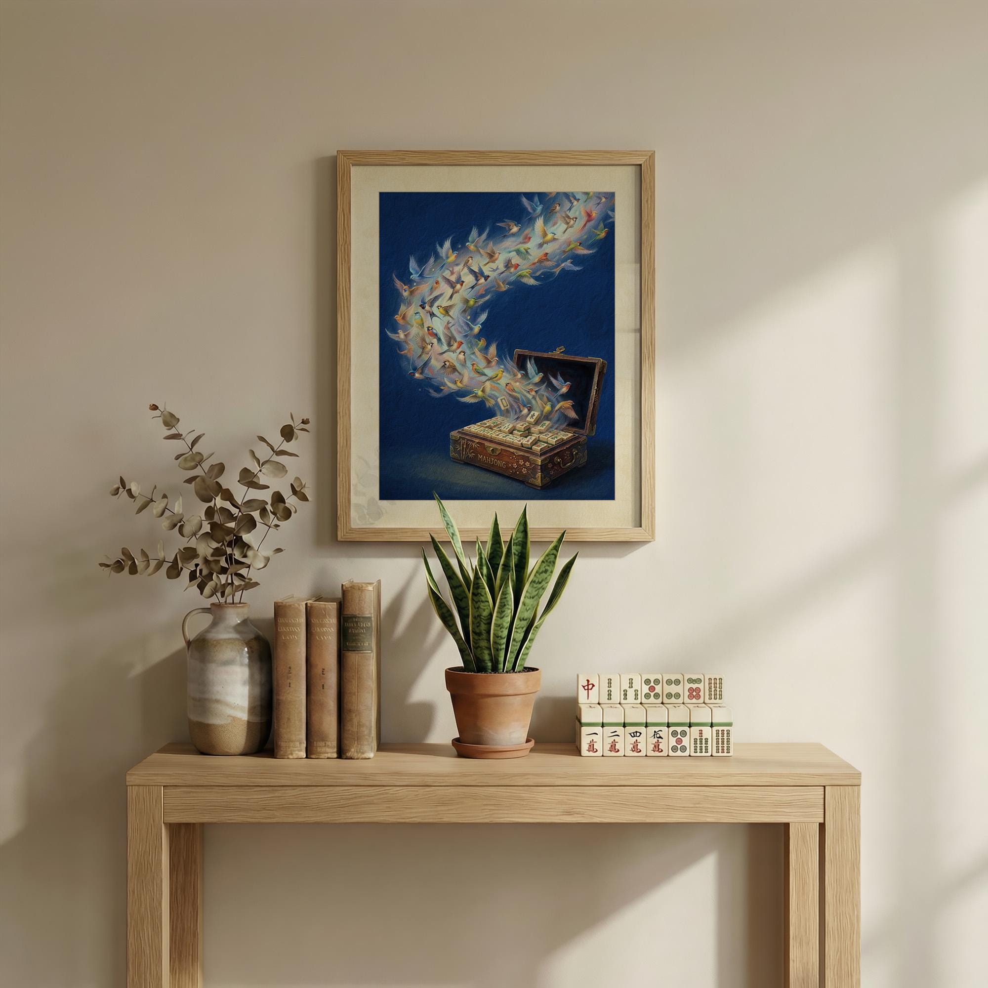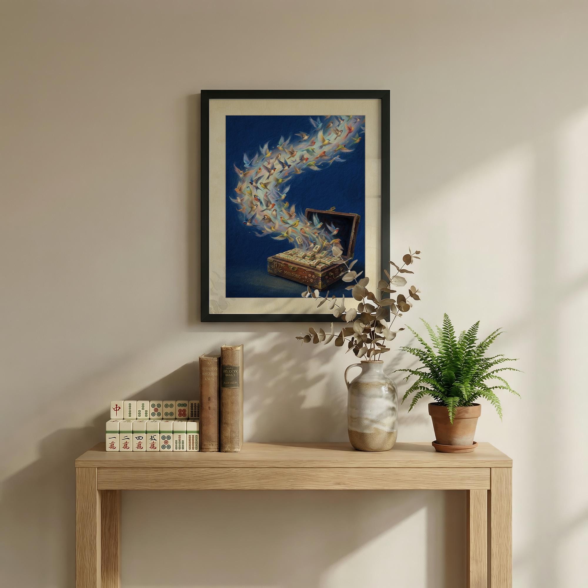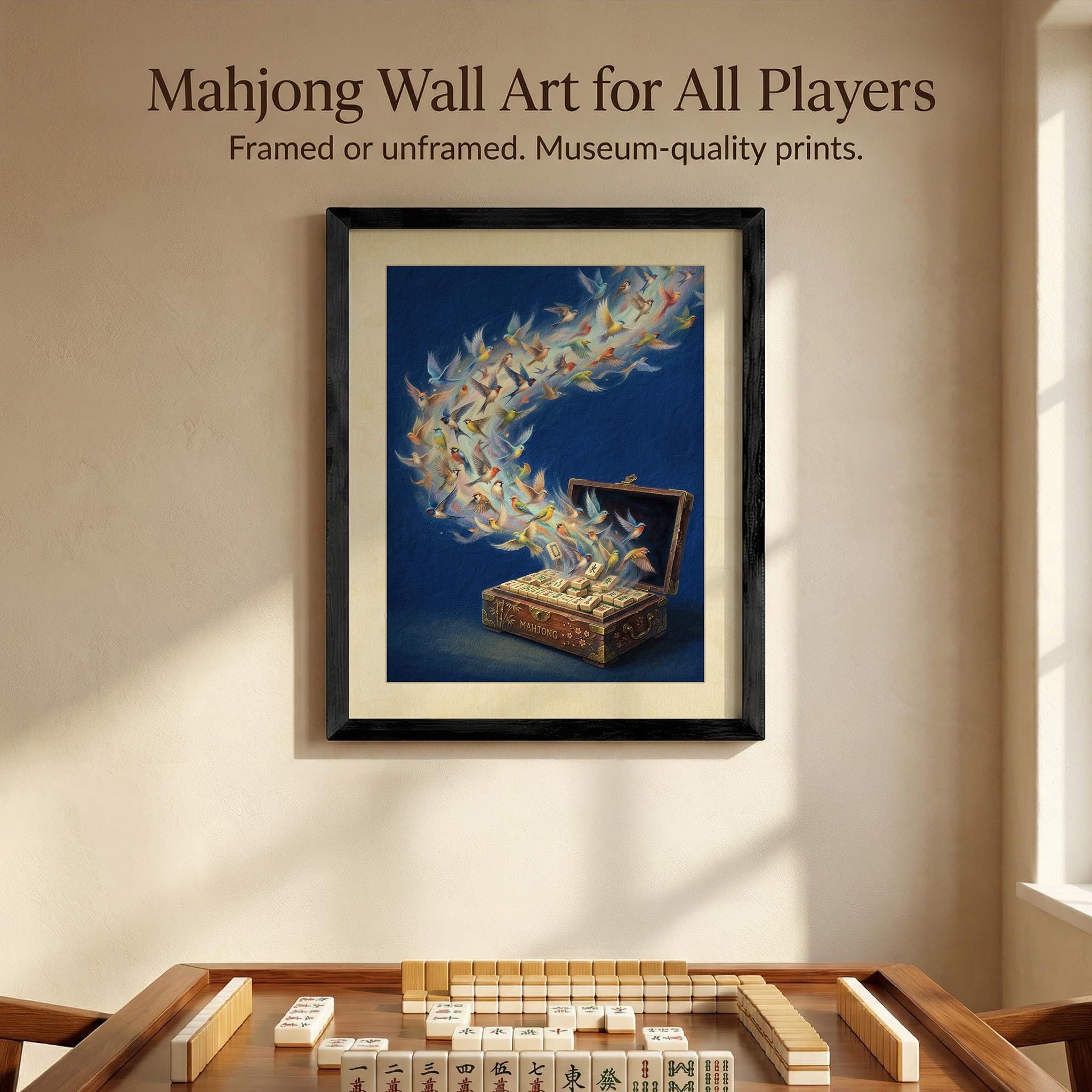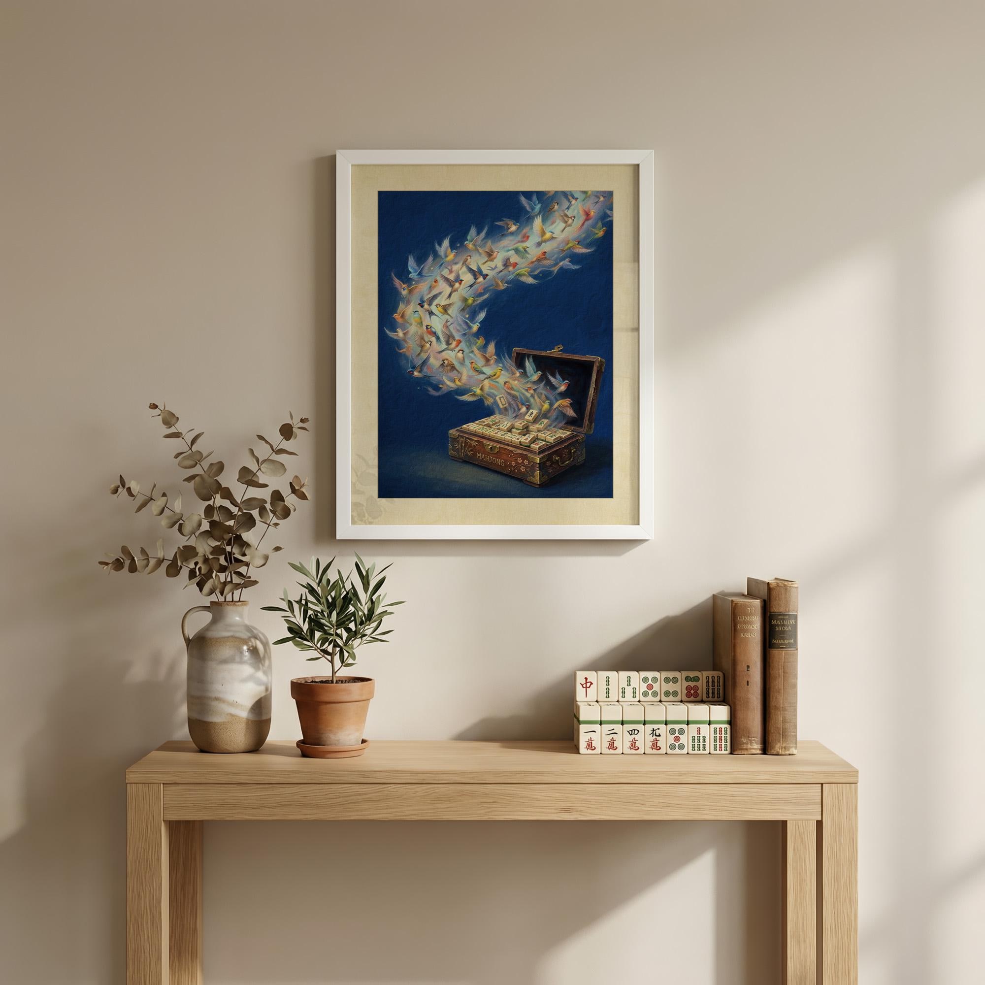 Witness the magic of the game come to life with this stunning surrealist print of songbirds taking flight from a vintage mahjong chest. Featuring technically accurate traditional tiles and vibrant avian imagery, this deep blue masterpiece is the perfect statement piece for any sophisticated gaming room or study.