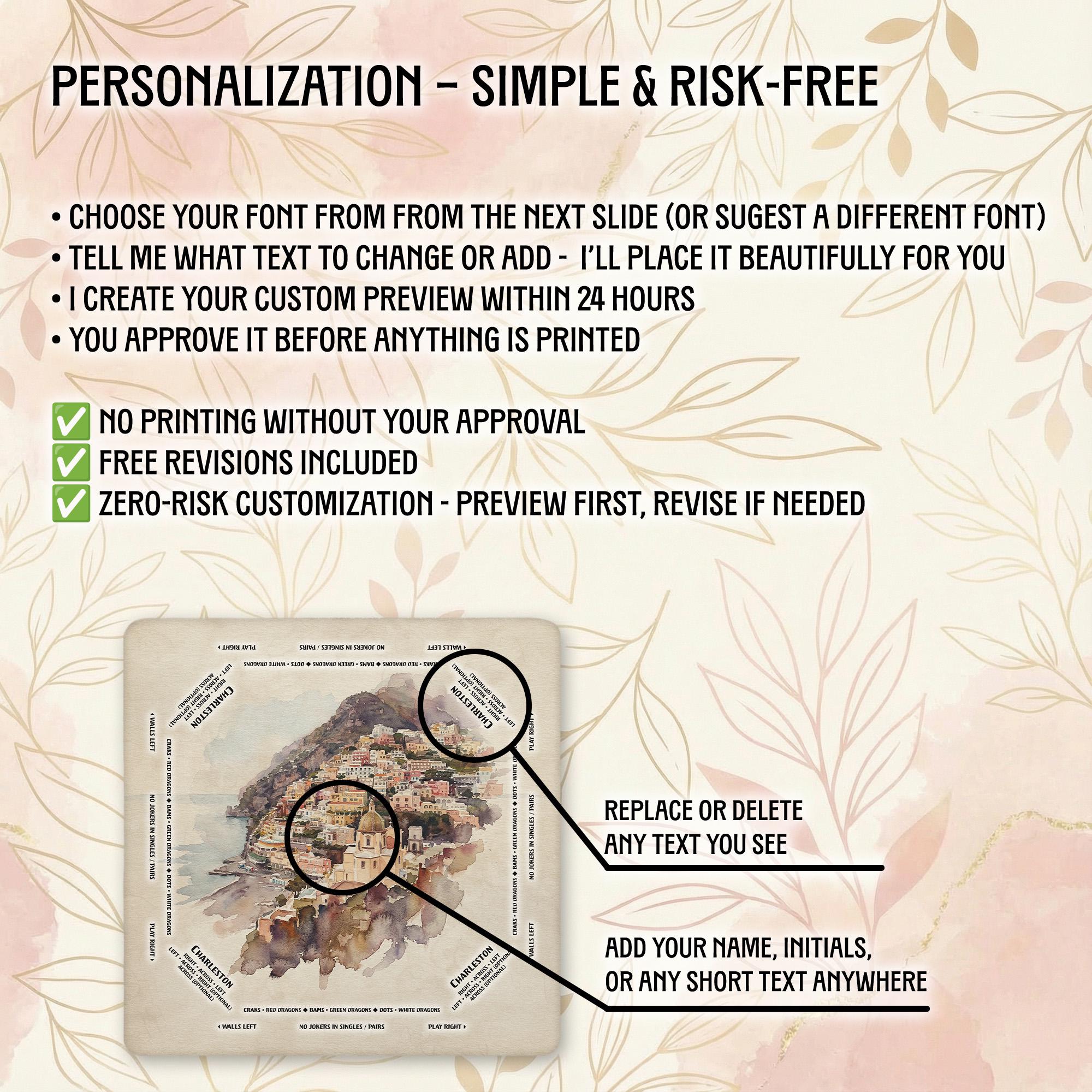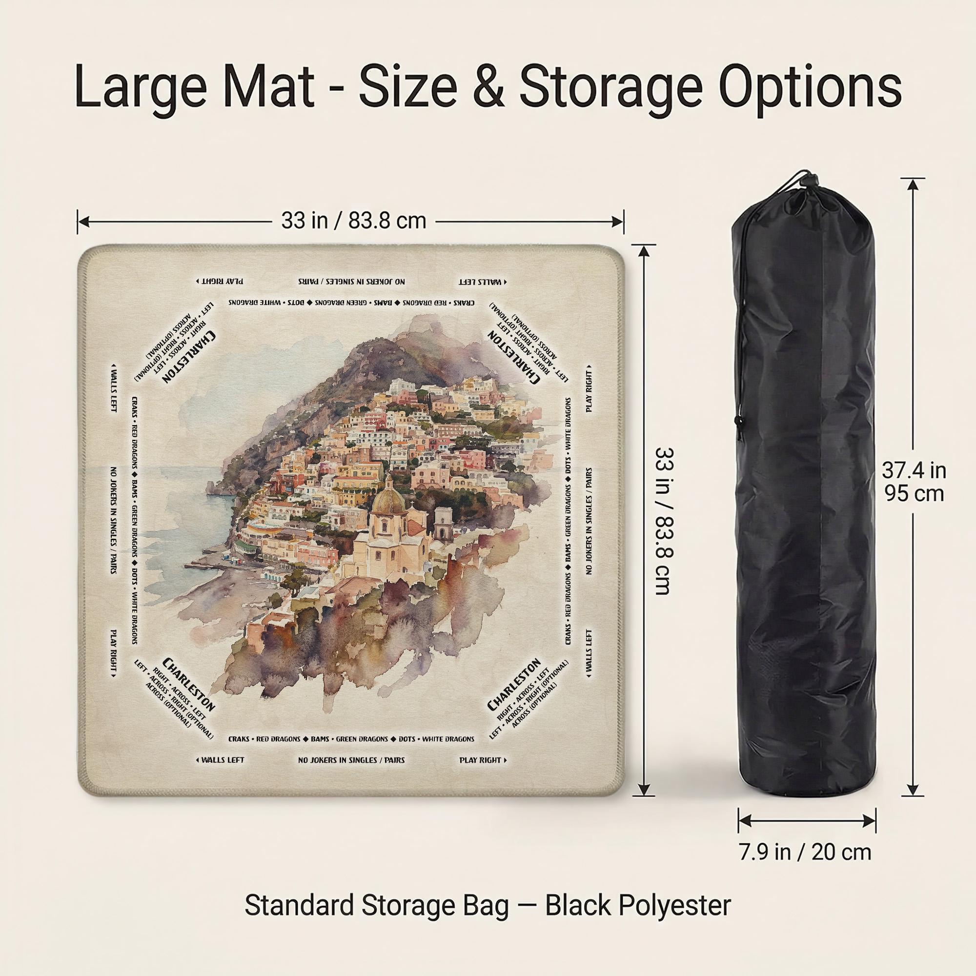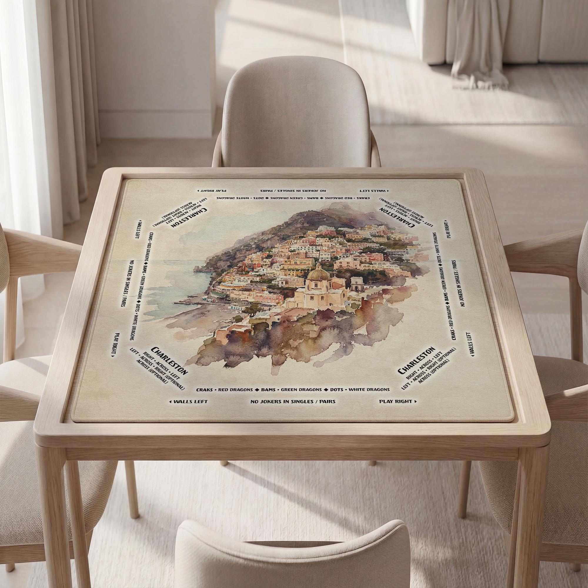 Elevate your game nights with this beautifully crafted Positano Amalfi Coast watercolor mahjong mat, designed to enhance both style and function. Featuring a custom name art option, this table cover offers a personalized touch that makes every game uniquely yours. Its anti-slip base ensures a stable, noise-reduced surface perfect for focused play and travel.