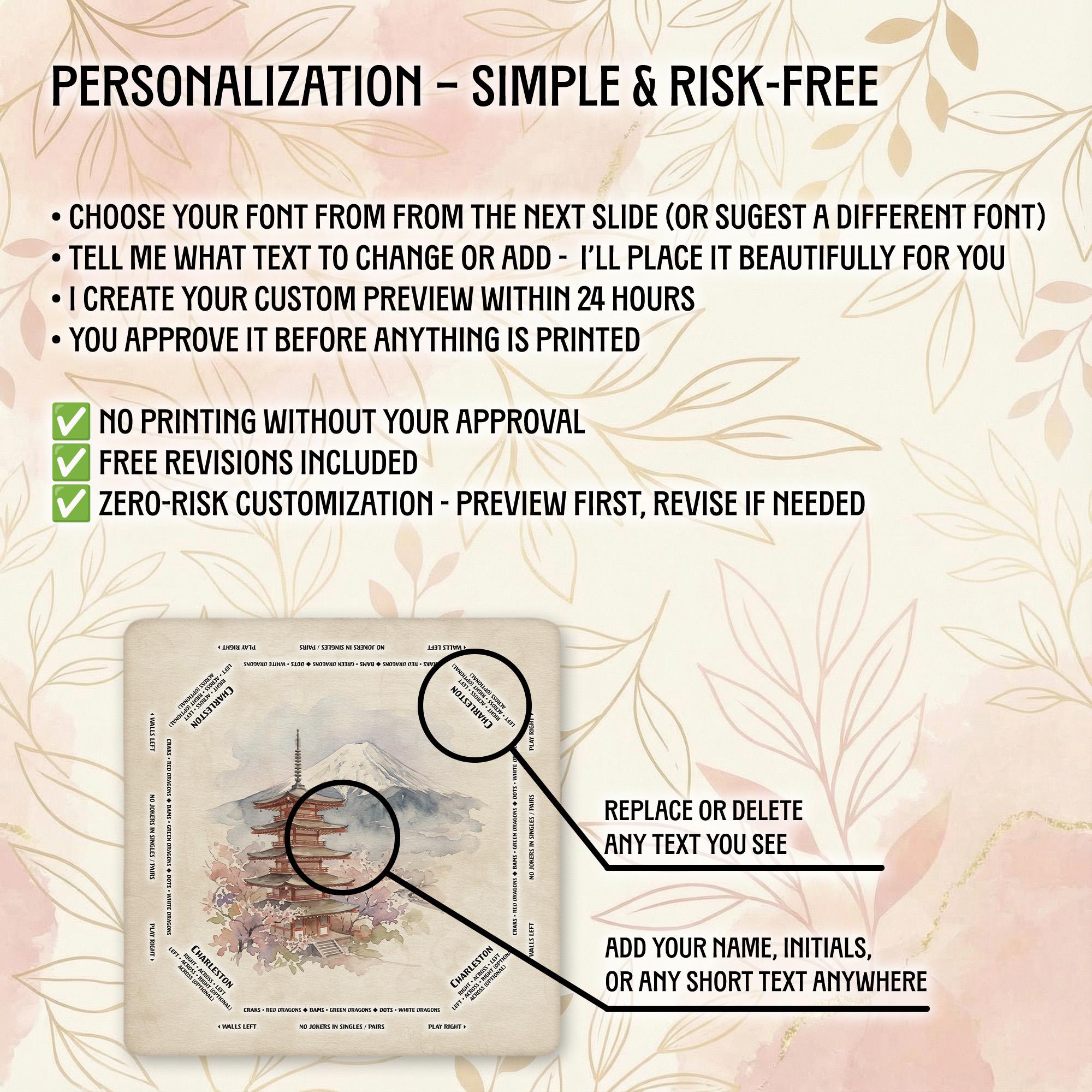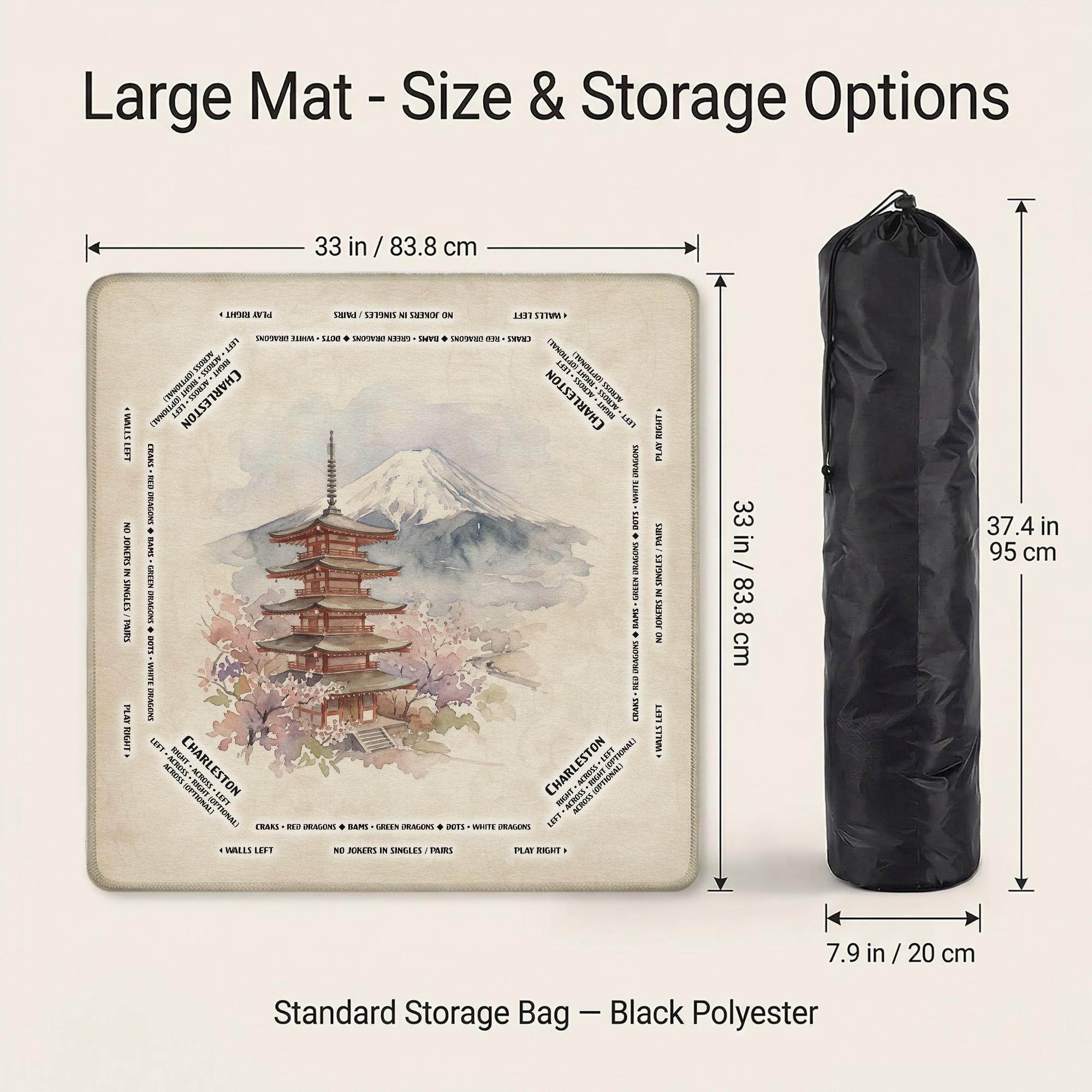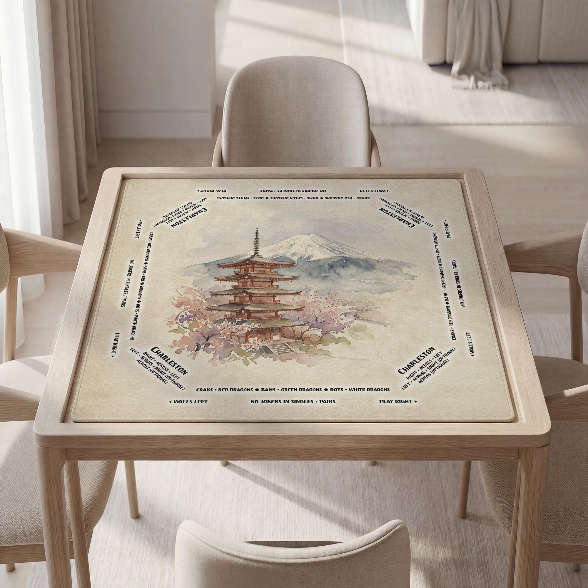 Elevate your game nights with a beautifully crafted mahjong mat inspired by the serene Mount Fuji Pagoda and delicate sakura art design. This custom name mahjong mat combines elegance with practicality, featuring a soft polyester top and thick cushioning mat that ensures a quiet tile surface for focused play. Whether at home or on the go, its compact travel mat design with a black carry pouch makes it an essential addition to any game night.