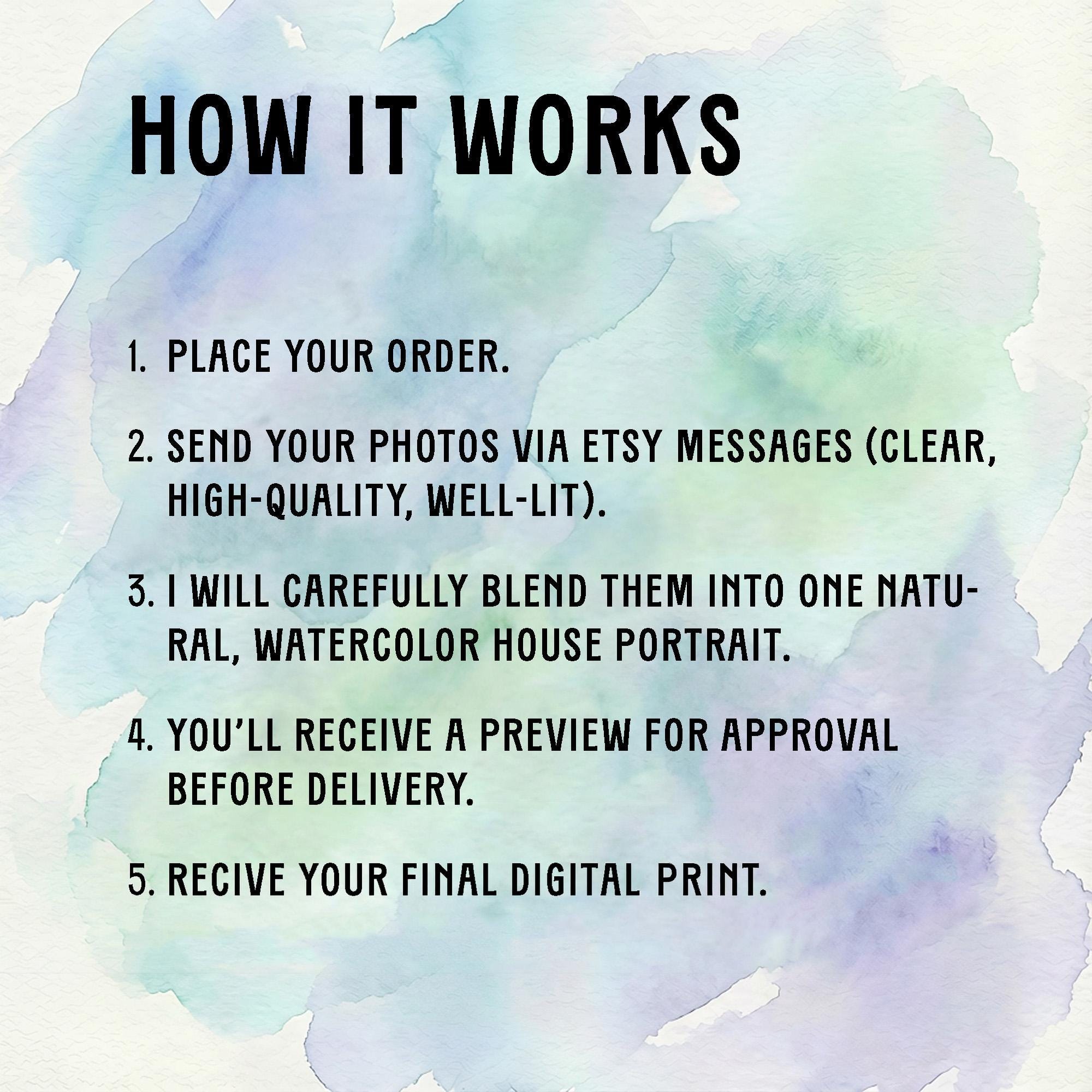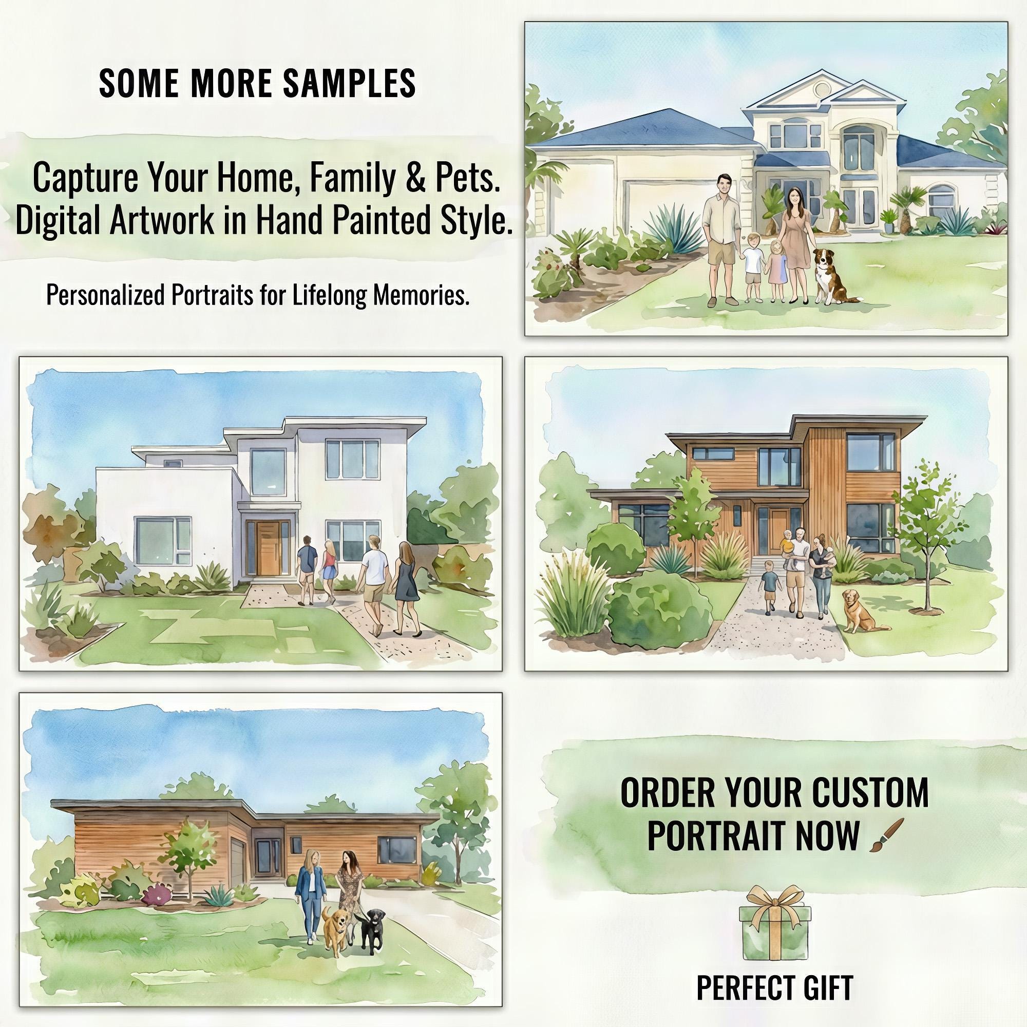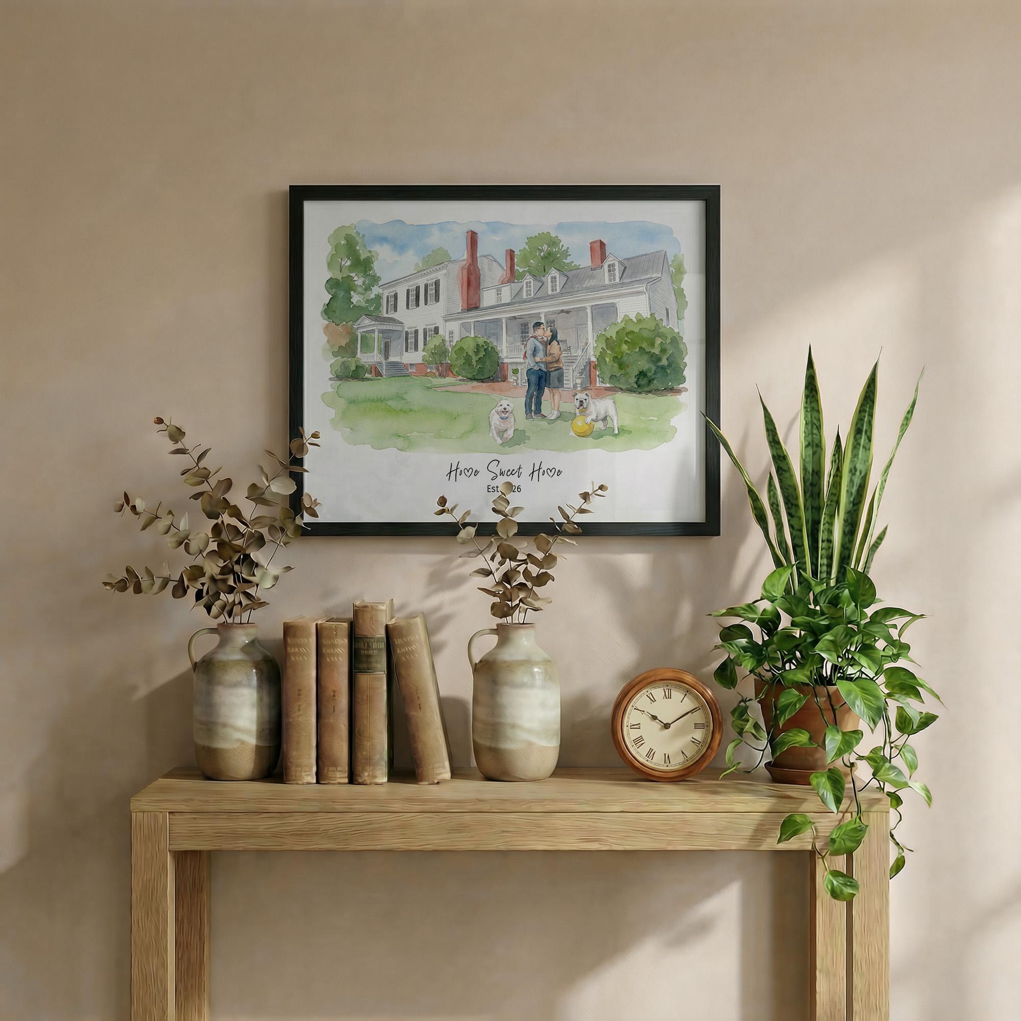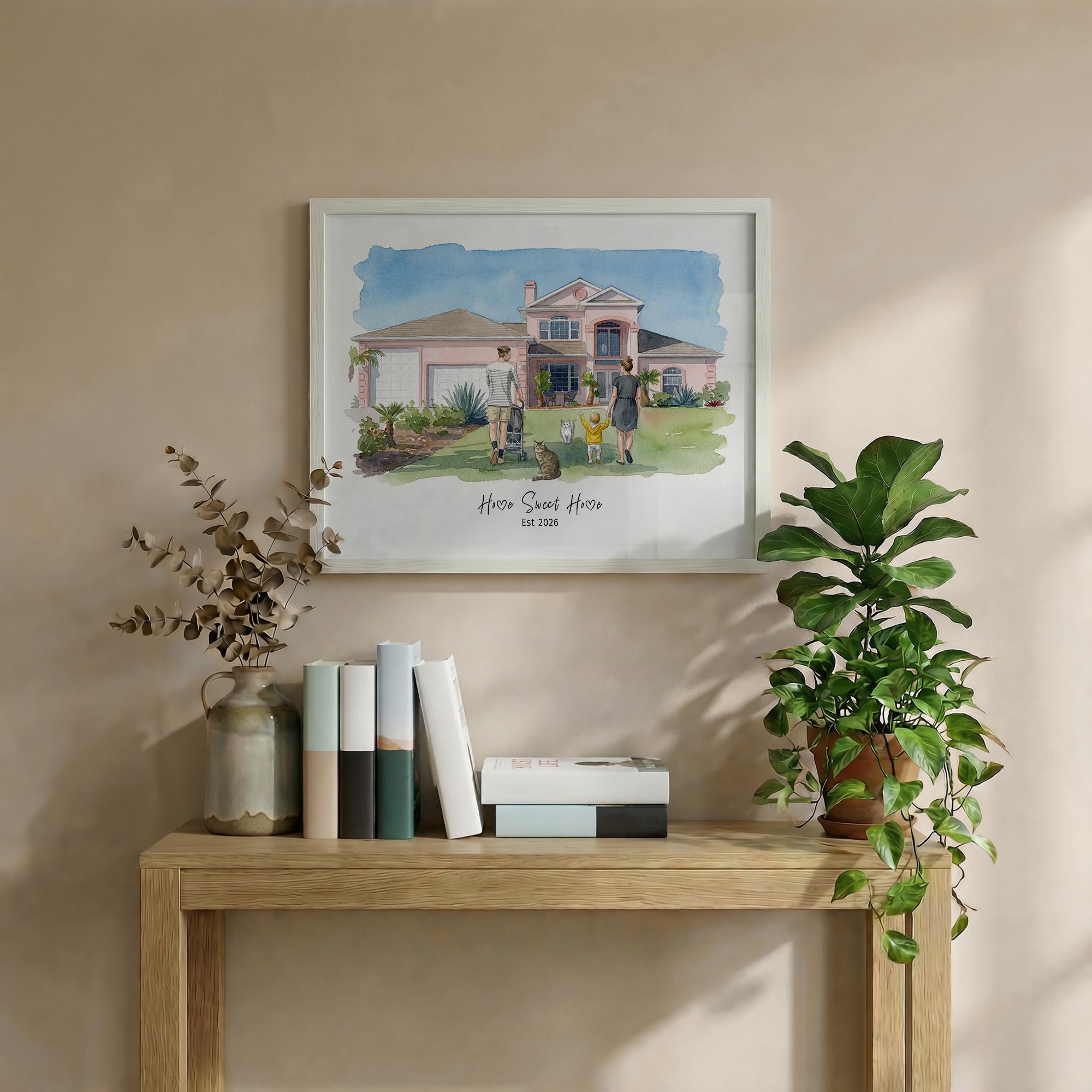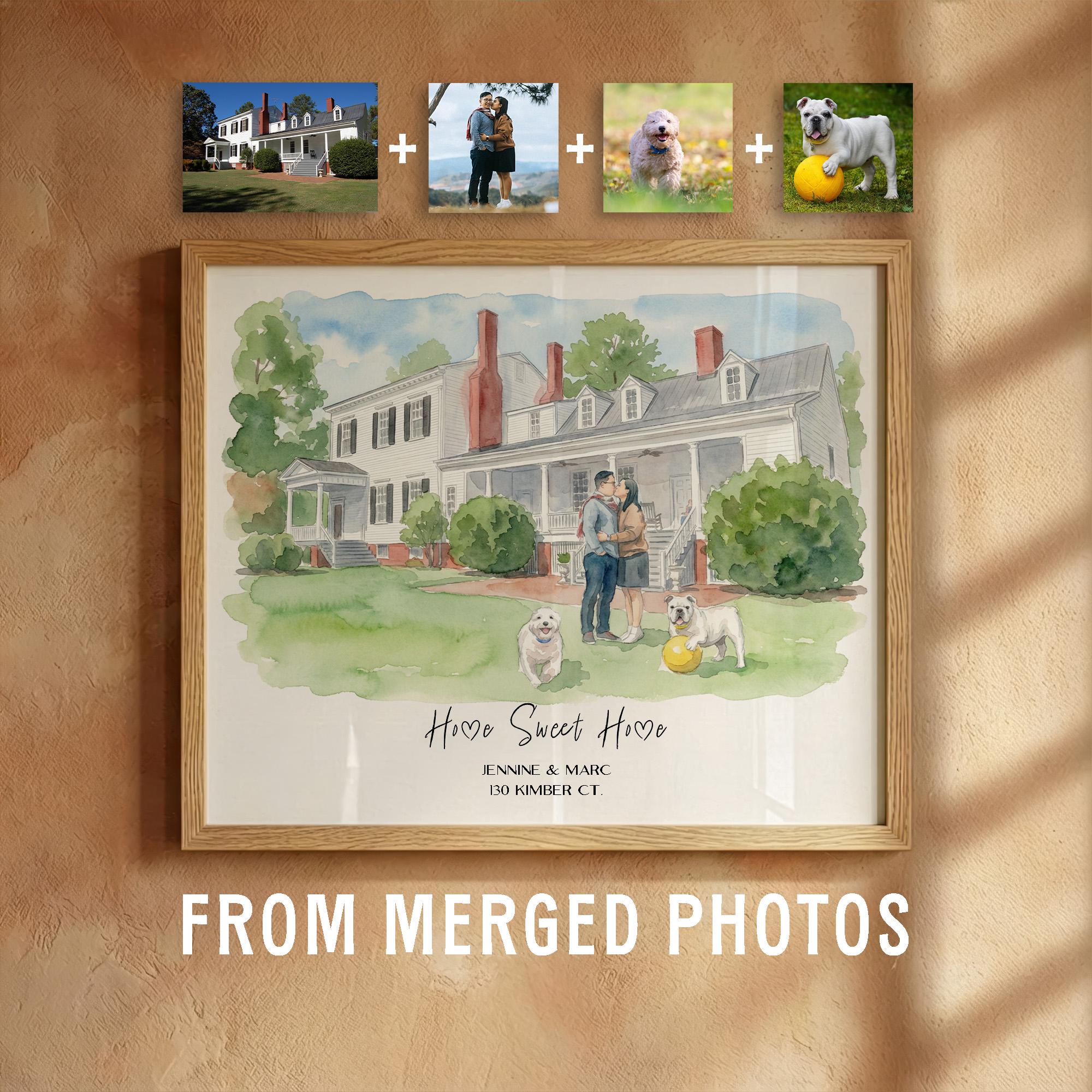 A fully personalized, digitally painted yet hand-finished style watercolor portrait featuring your house, you, and optional pets โ always unique, never mass-produced.