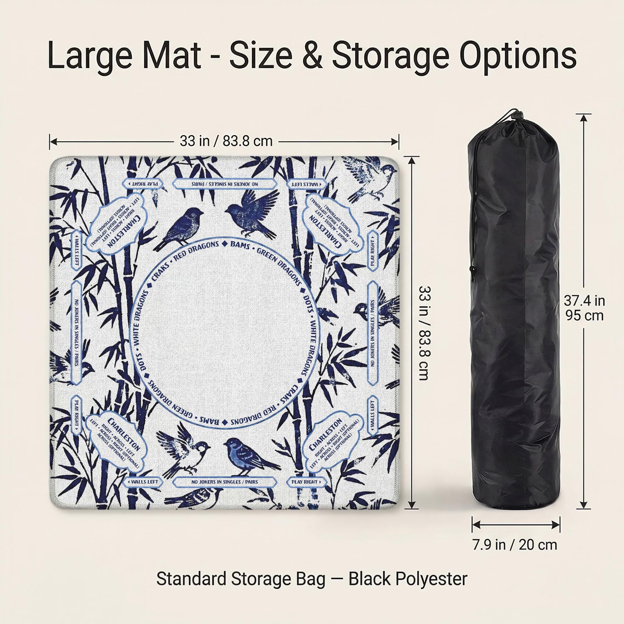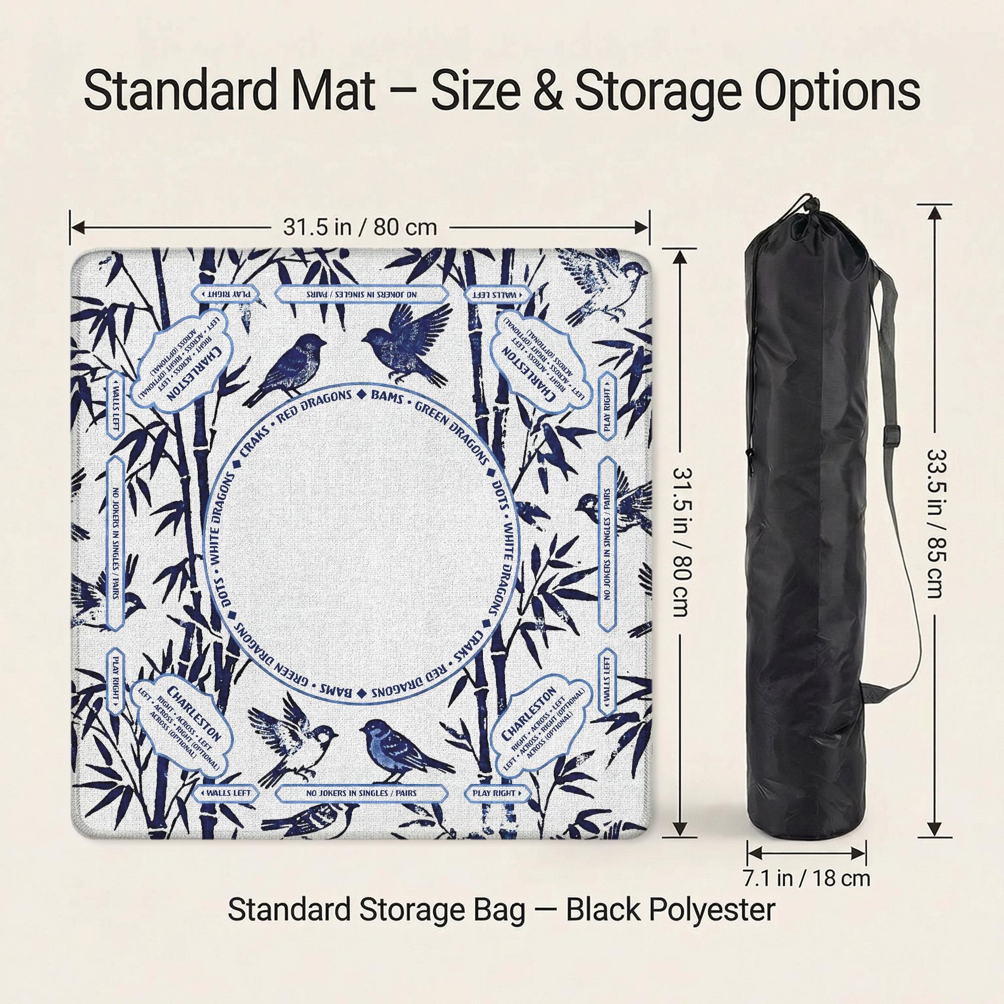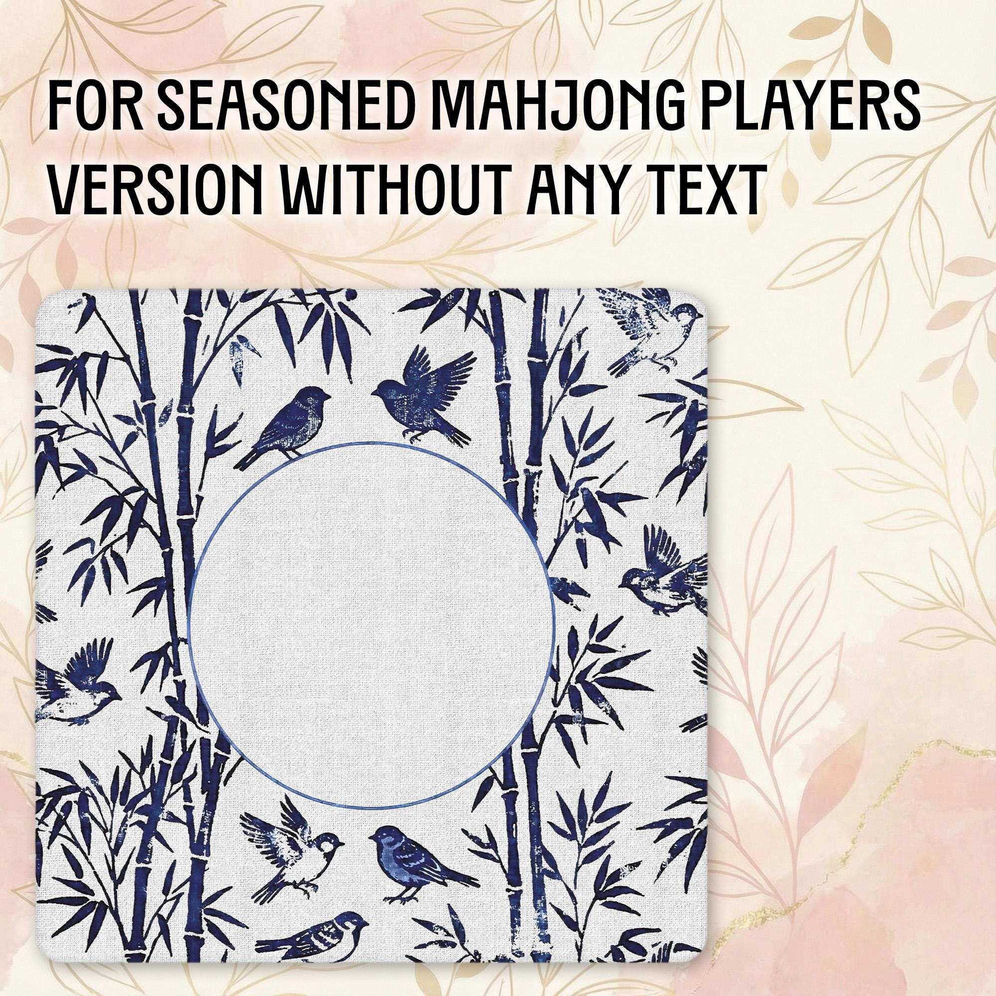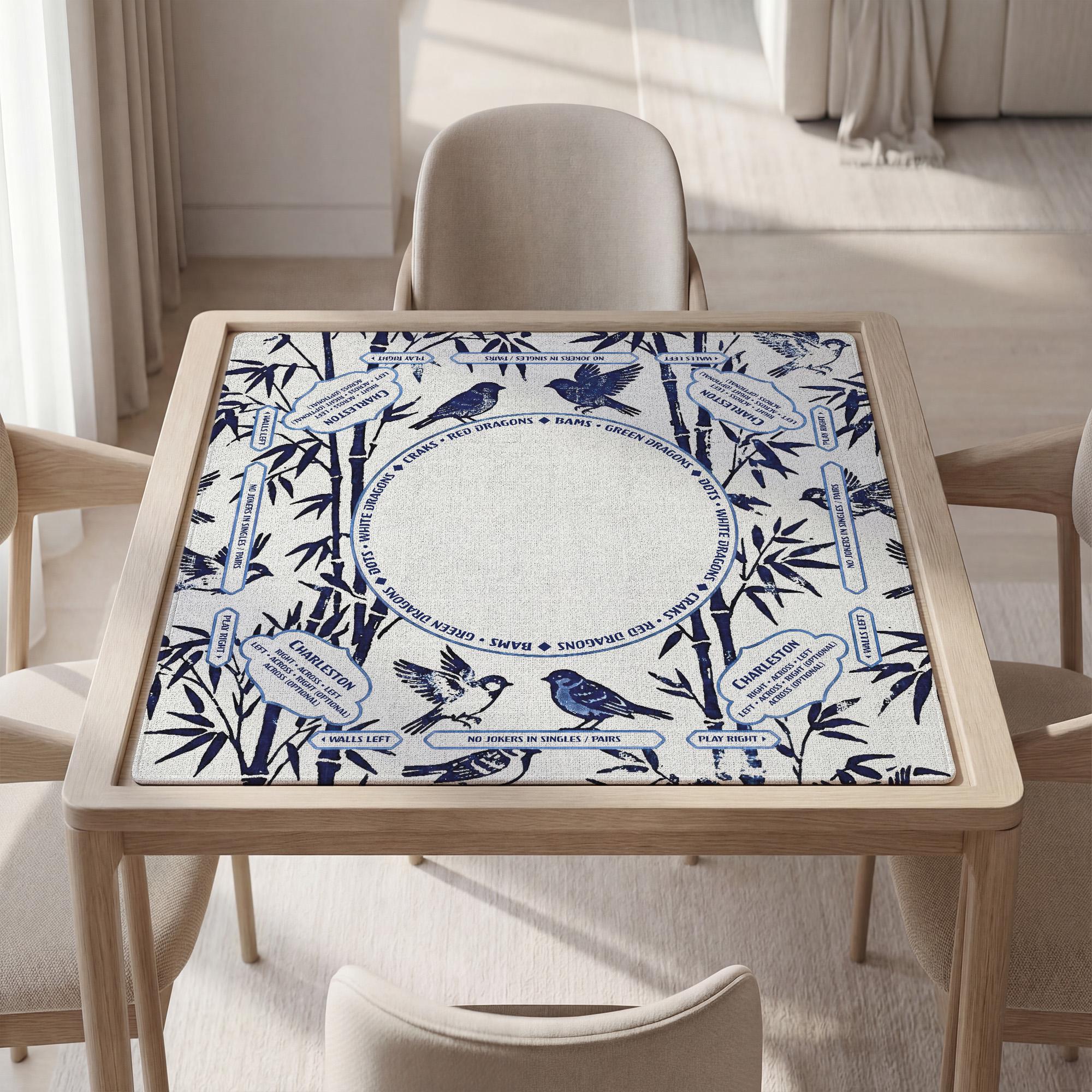 Elevate your tabletop with this elegant blue and white bamboo mahjong mat featuring vintage bird art. This waterproof, anti-slip gaming pad offers superior noise reduction and customizable text for a professional experience.