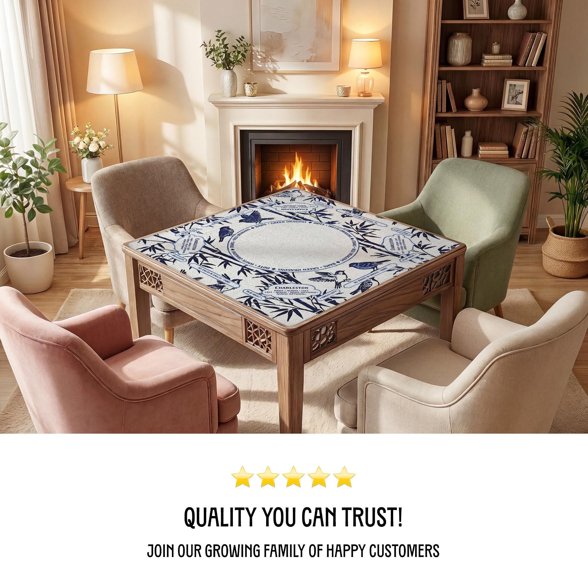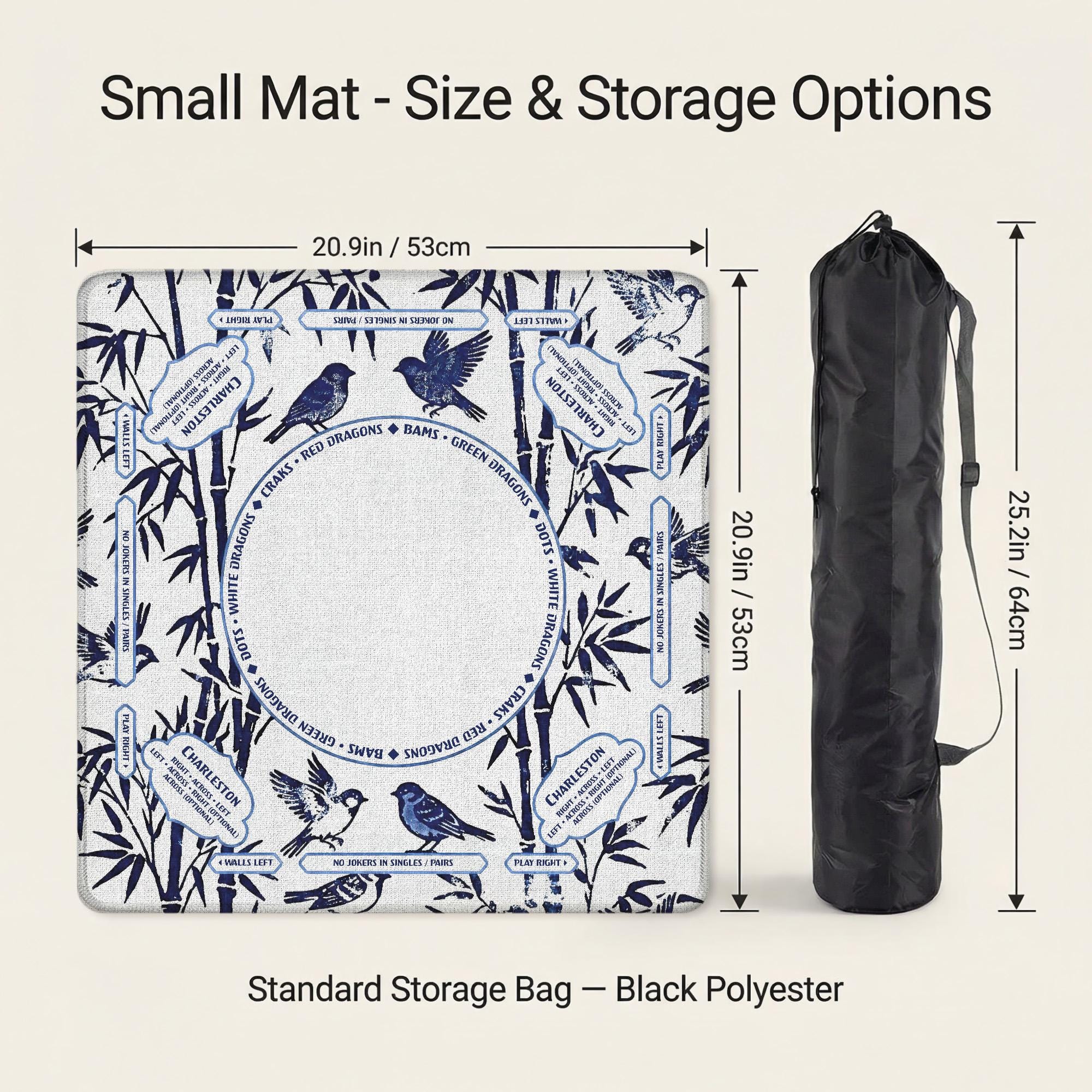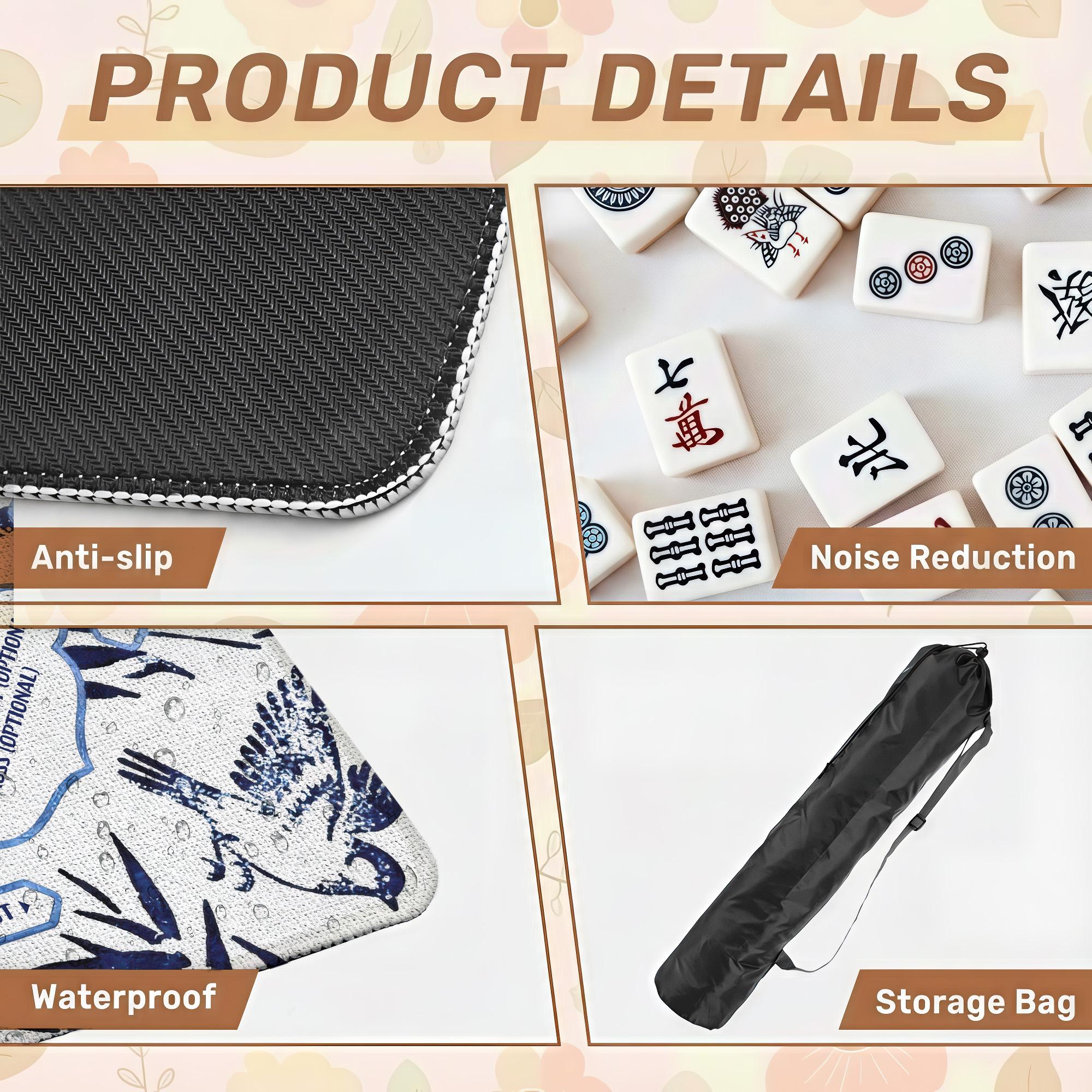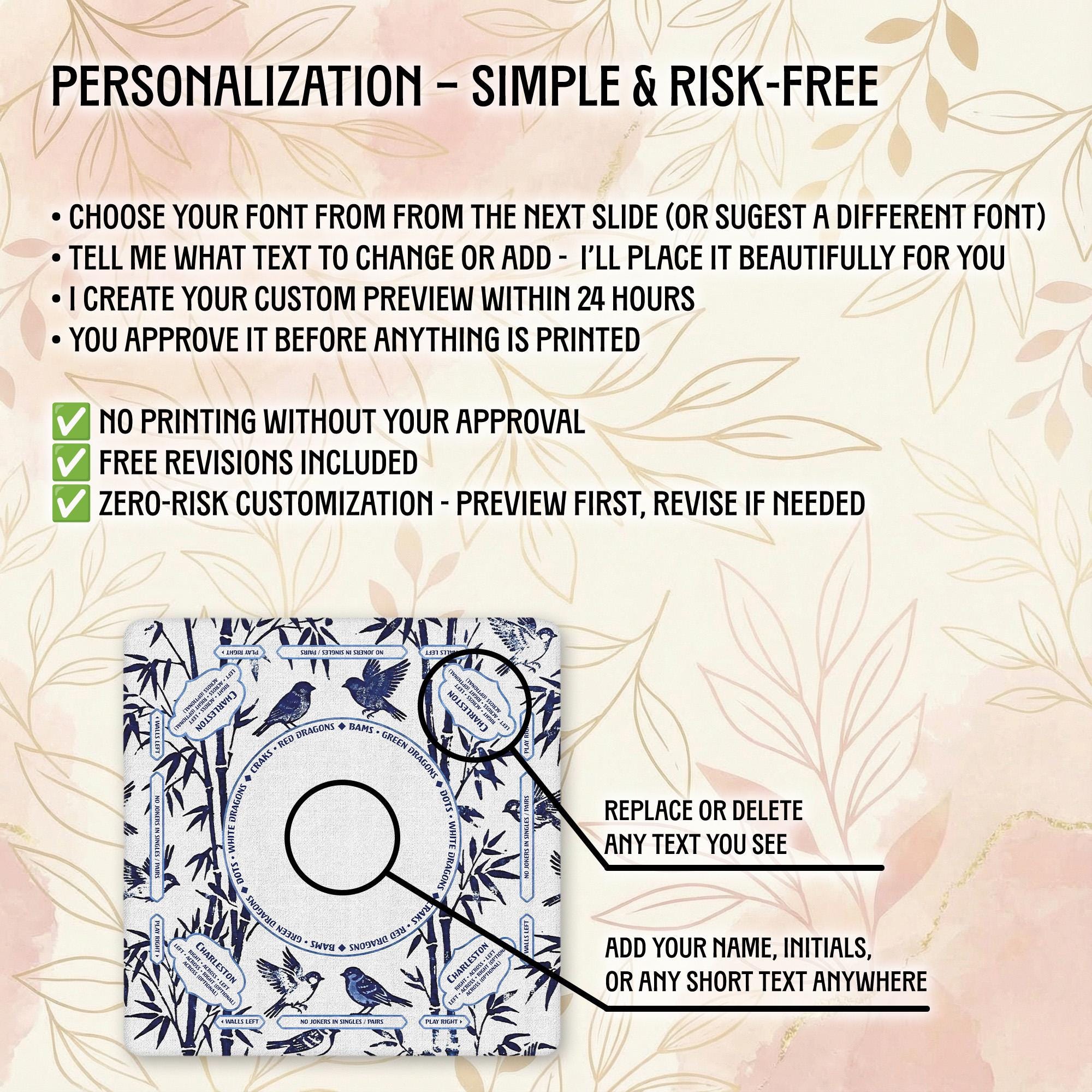 Elevate your tabletop with this elegant blue and white bamboo mahjong mat featuring vintage bird art. This waterproof, anti-slip gaming pad offers superior noise reduction and customizable text for a professional experience.
