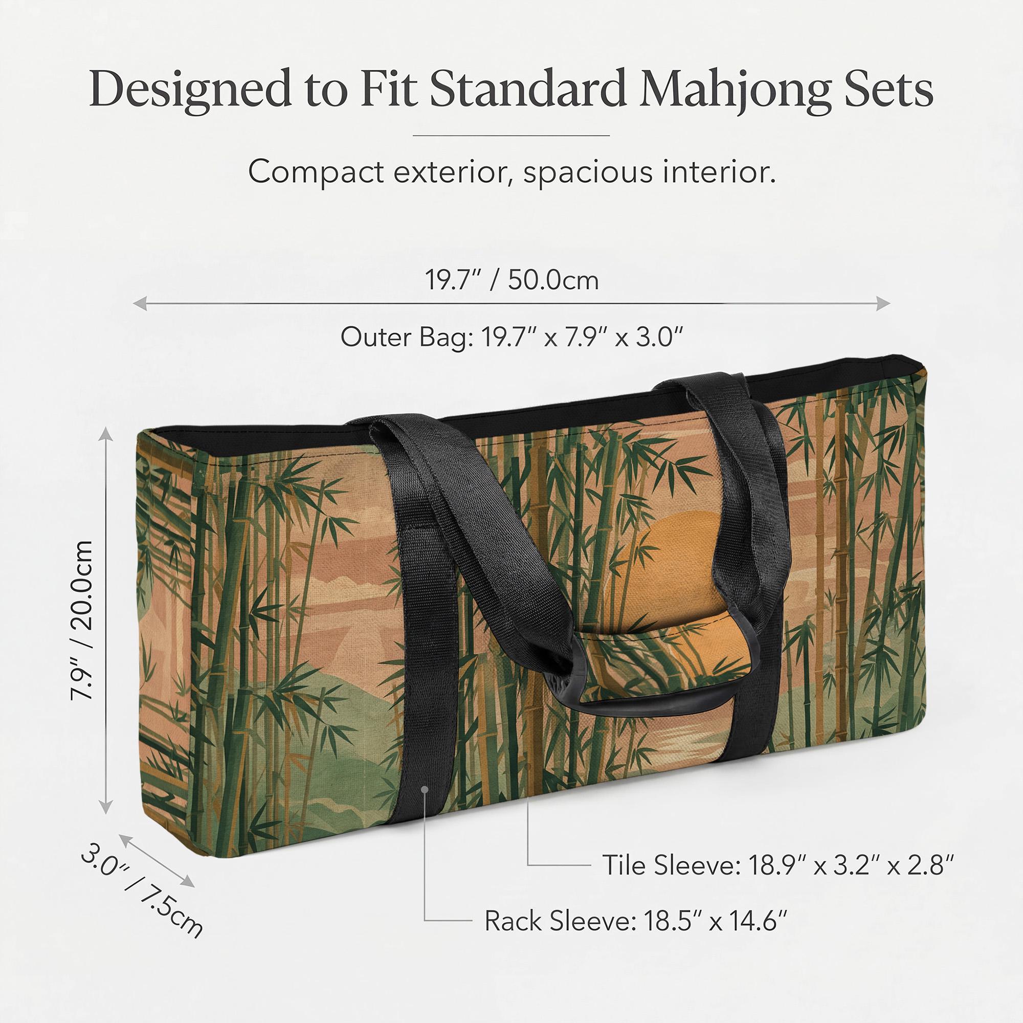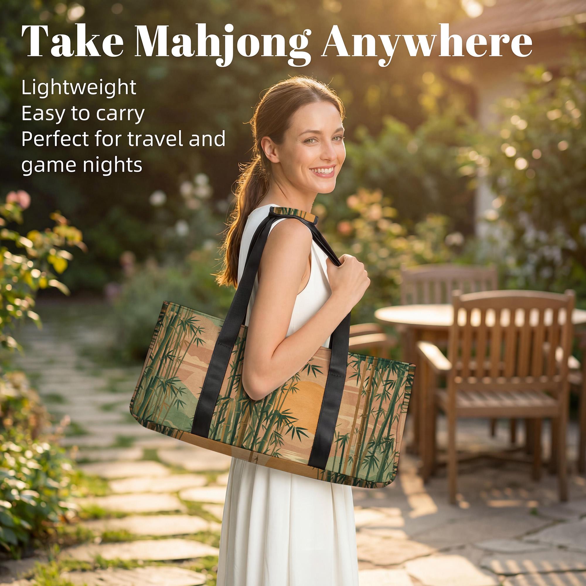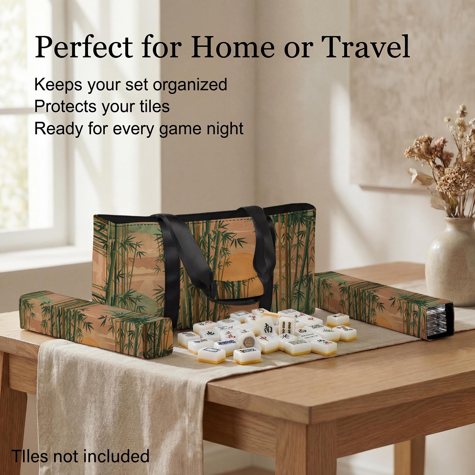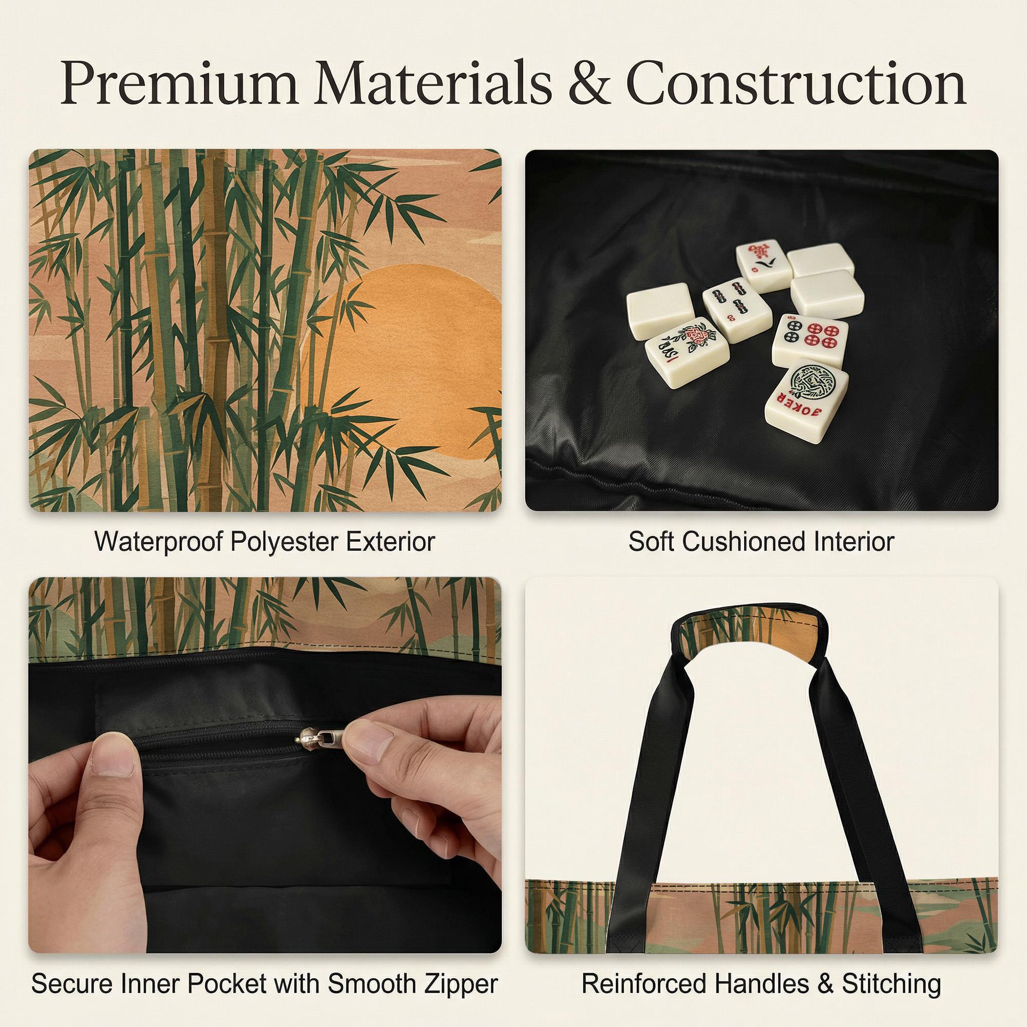 This elegant mahjong travel set features a serene bamboo forest sunset design and includes dedicated storage sleeves for your tiles and racks. The waterproof exterior and cushioned interior ensure your accessories stay protected and organized for every social game night.