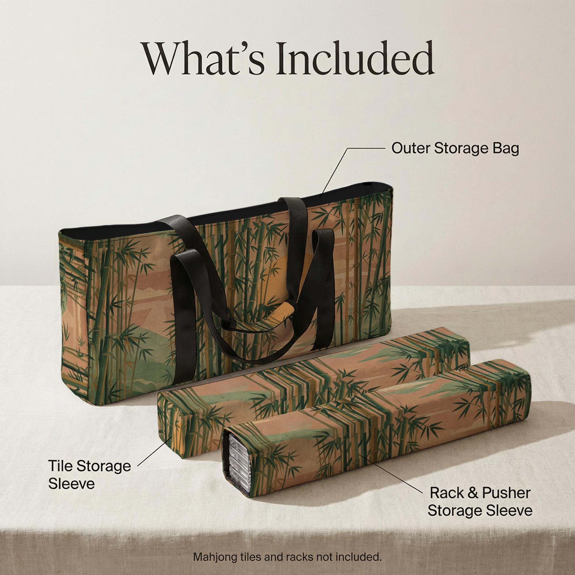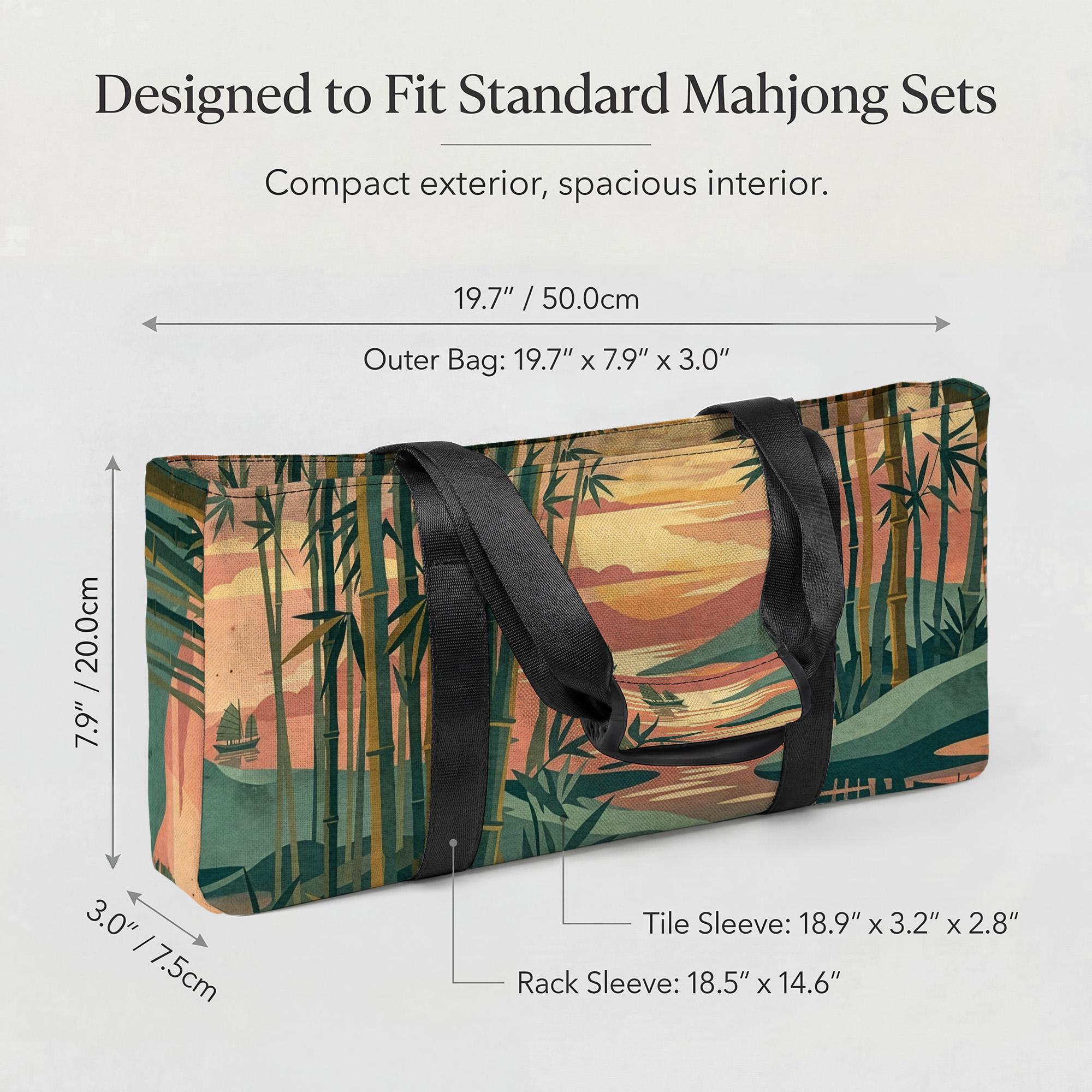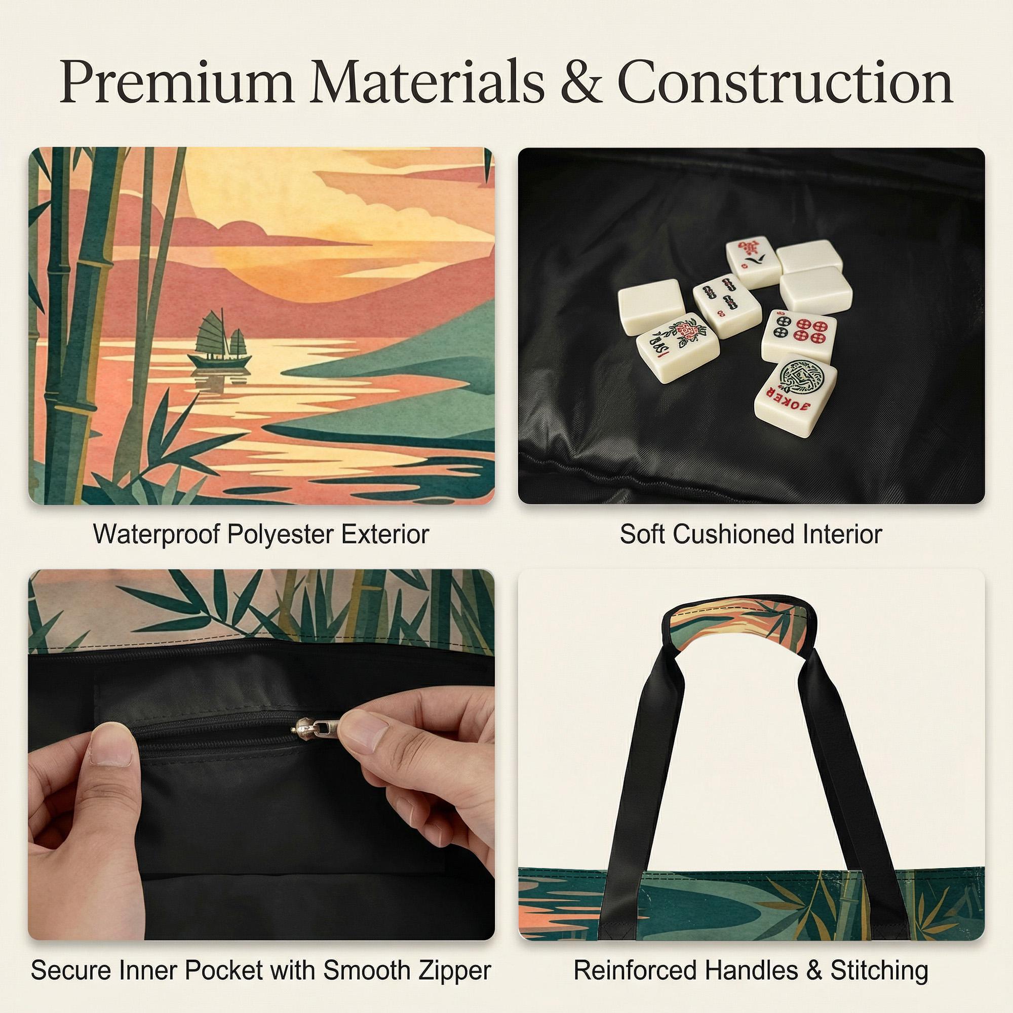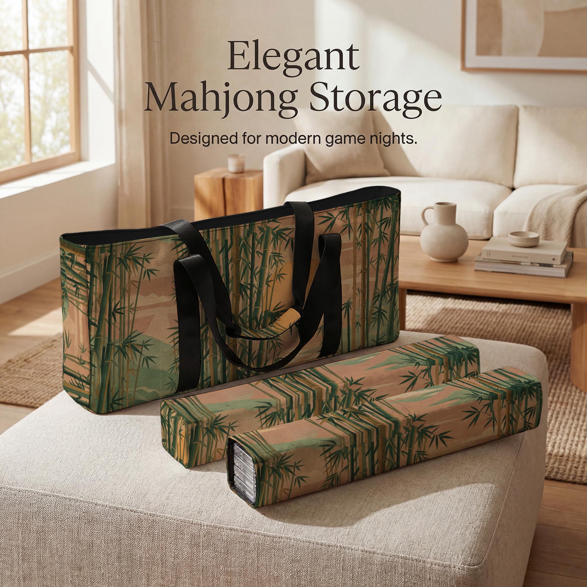 This elegant mahjong travel set features a serene bamboo forest sunset design and includes dedicated storage sleeves for your tiles and racks. The waterproof exterior and cushioned interior ensure your accessories stay protected and organized for every social game night.