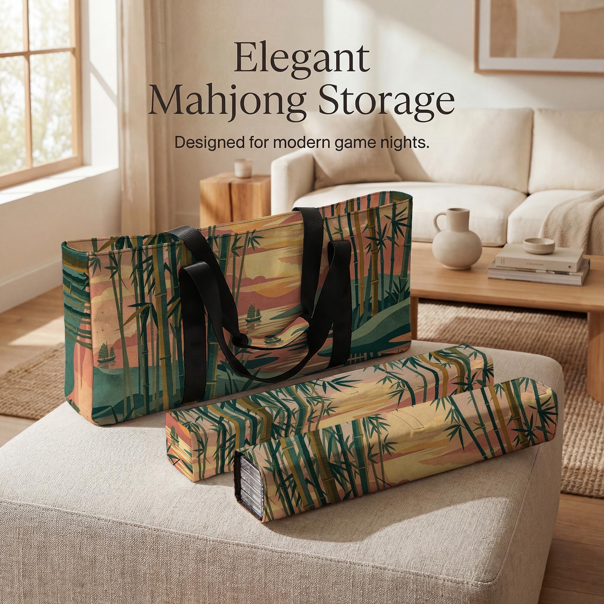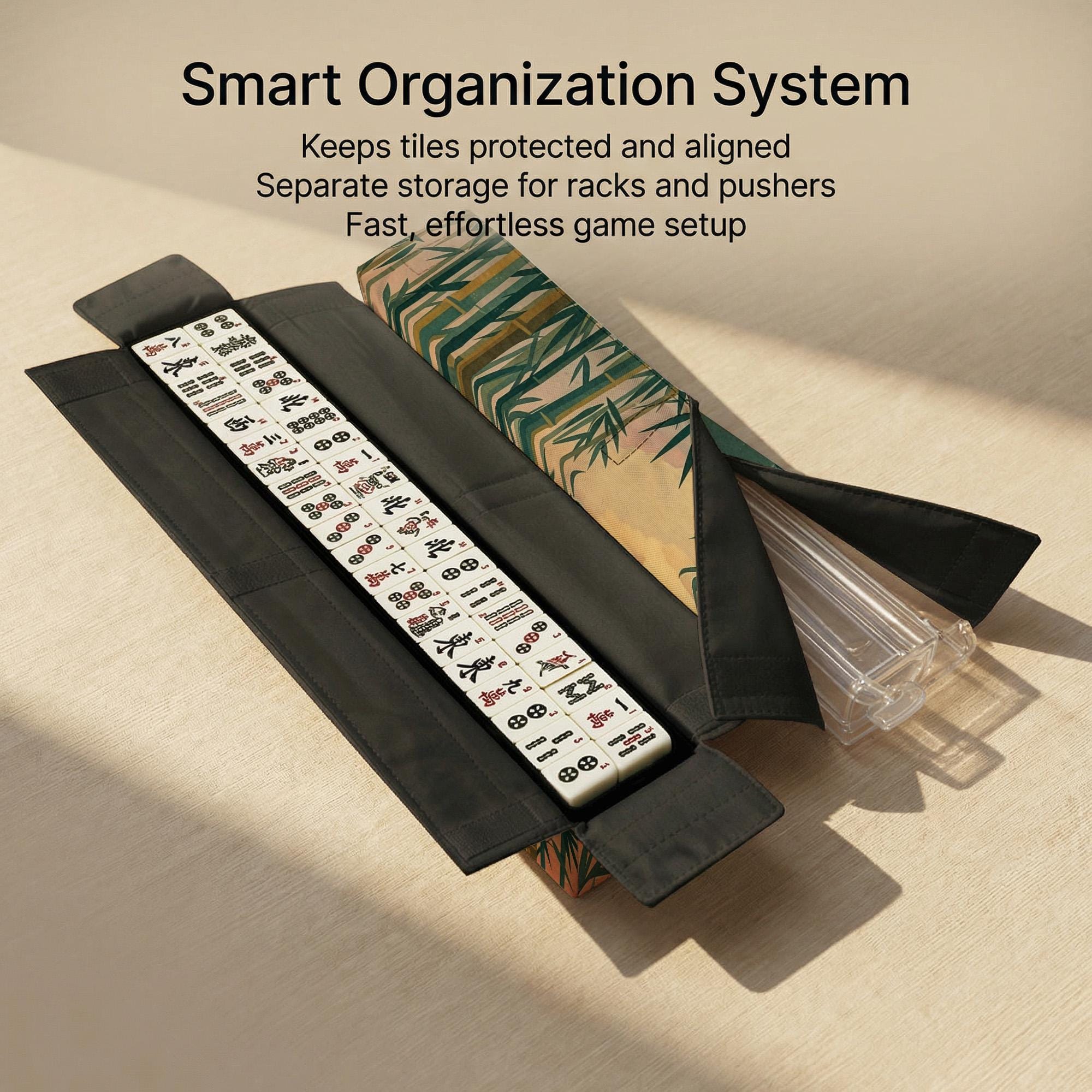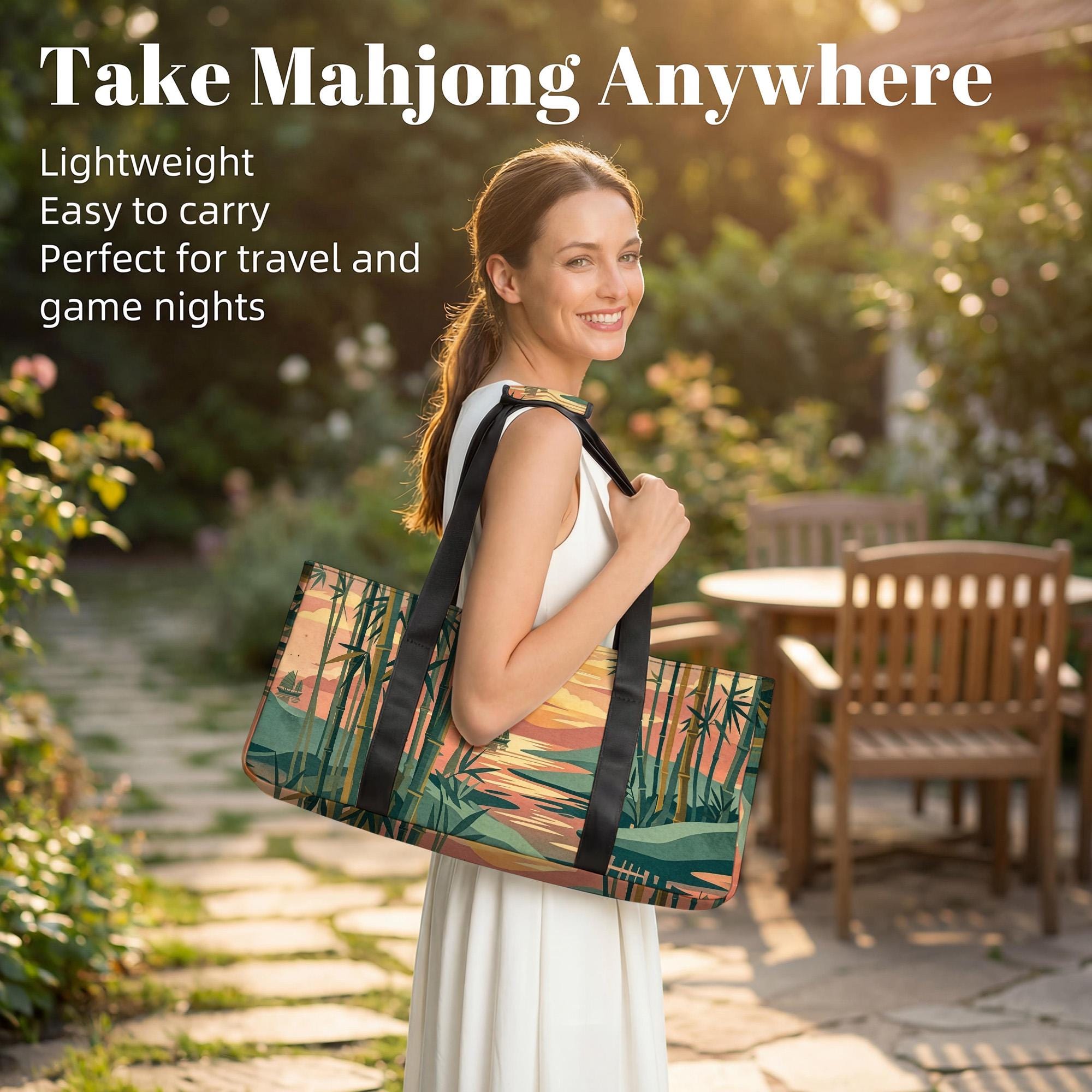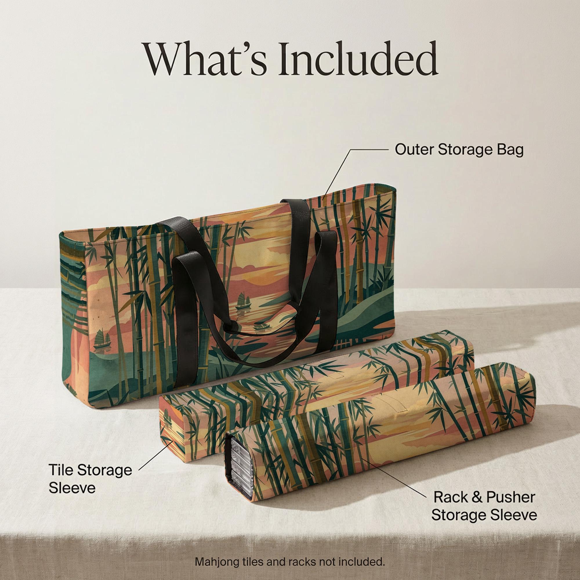 This elegant mahjong travel set features a serene bamboo forest sunset design and includes dedicated storage sleeves for your tiles and racks. The waterproof exterior and cushioned interior ensure your accessories stay protected and organized for every social game night.