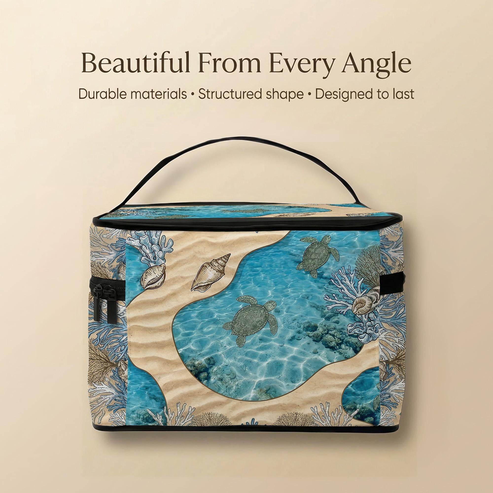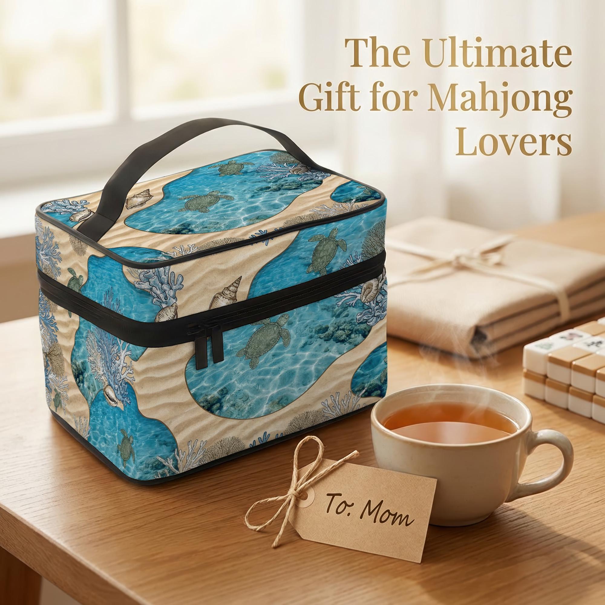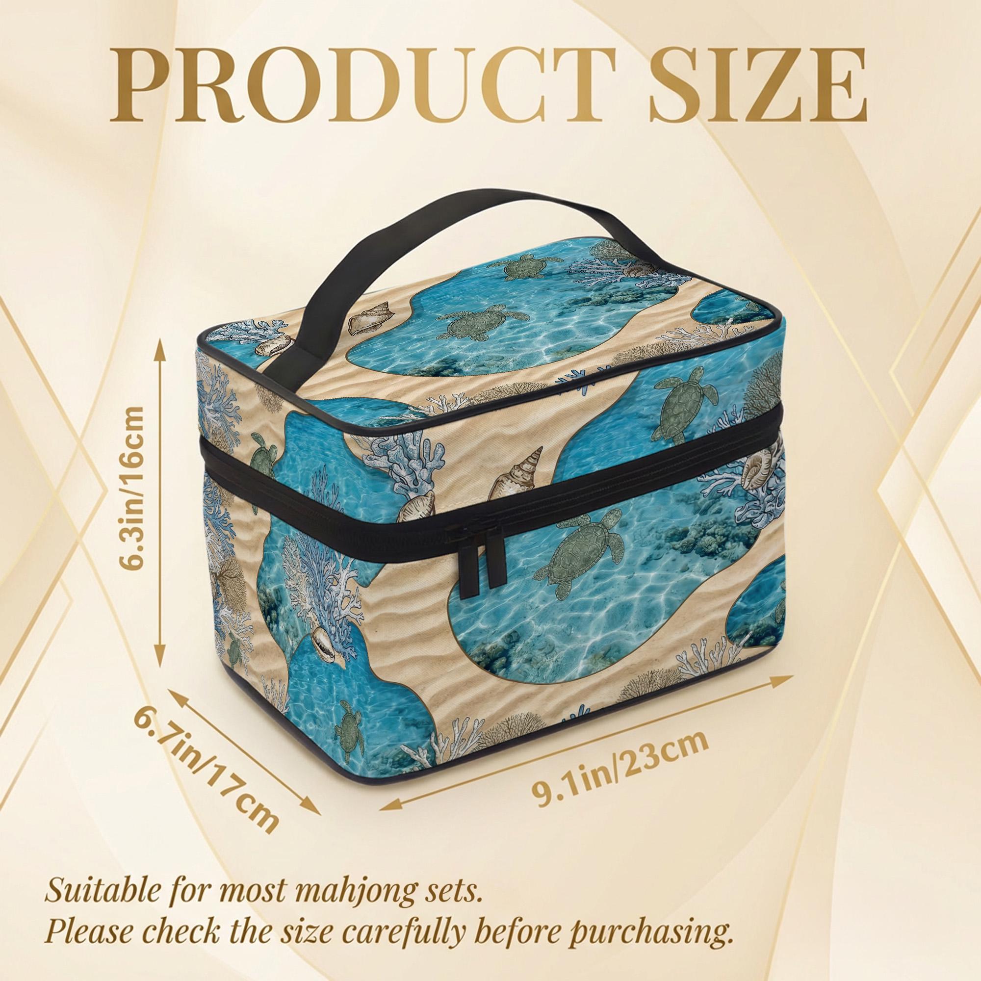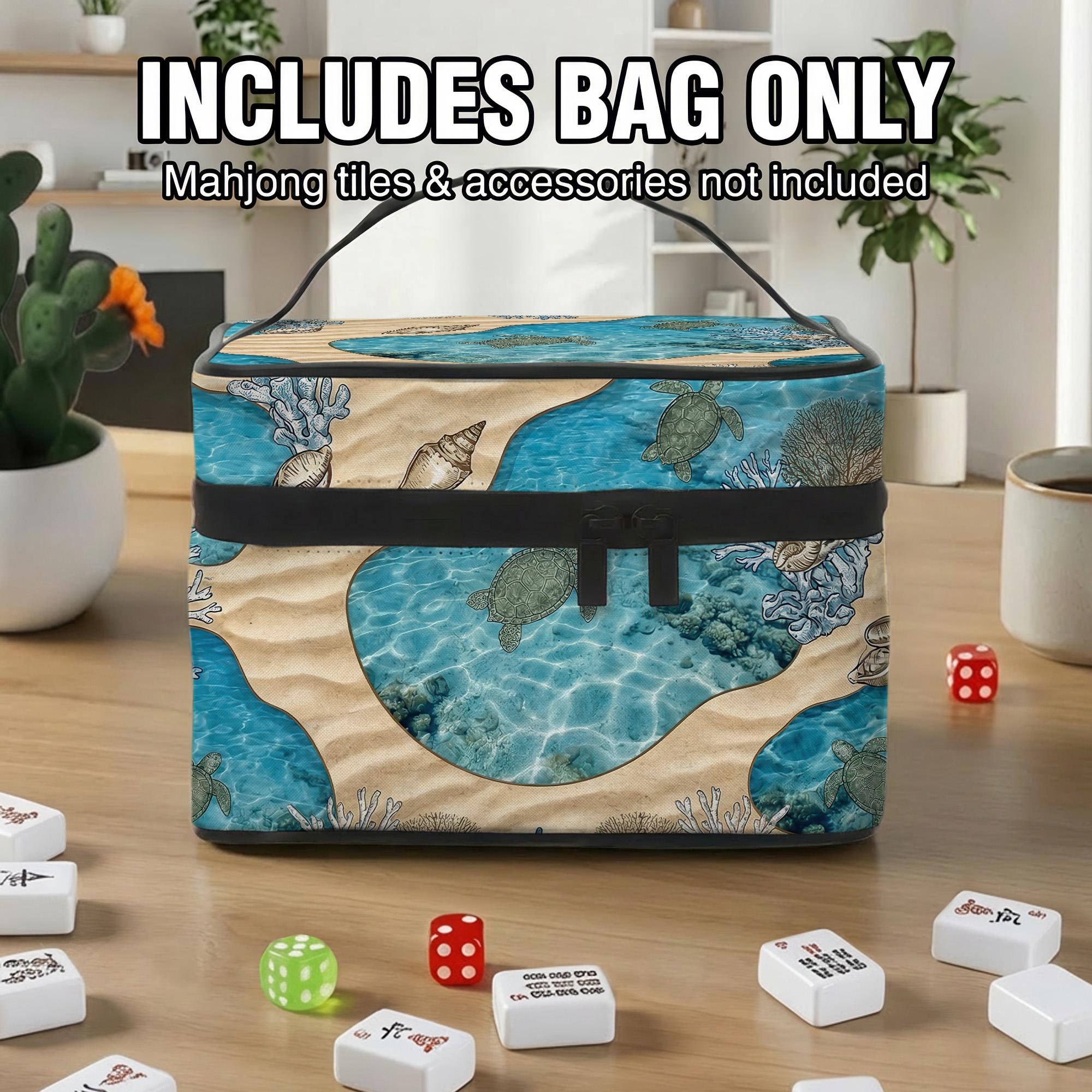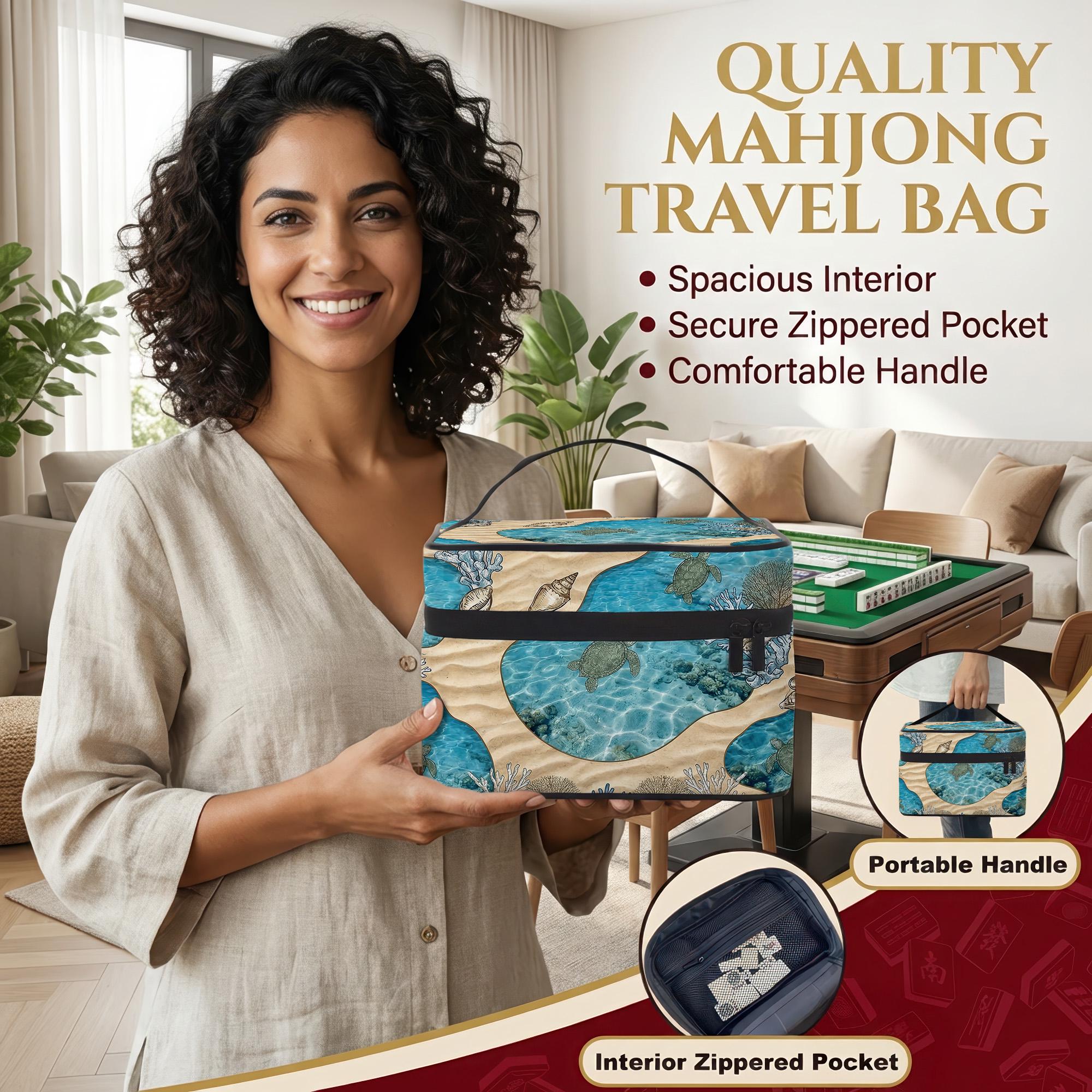 Carry your set in this stunning sea turtle mahjong travel bag featuring vibrant coral and shell art. This durable carrying case includes a secure interior mesh pocket and comfortable handle for easy transport.