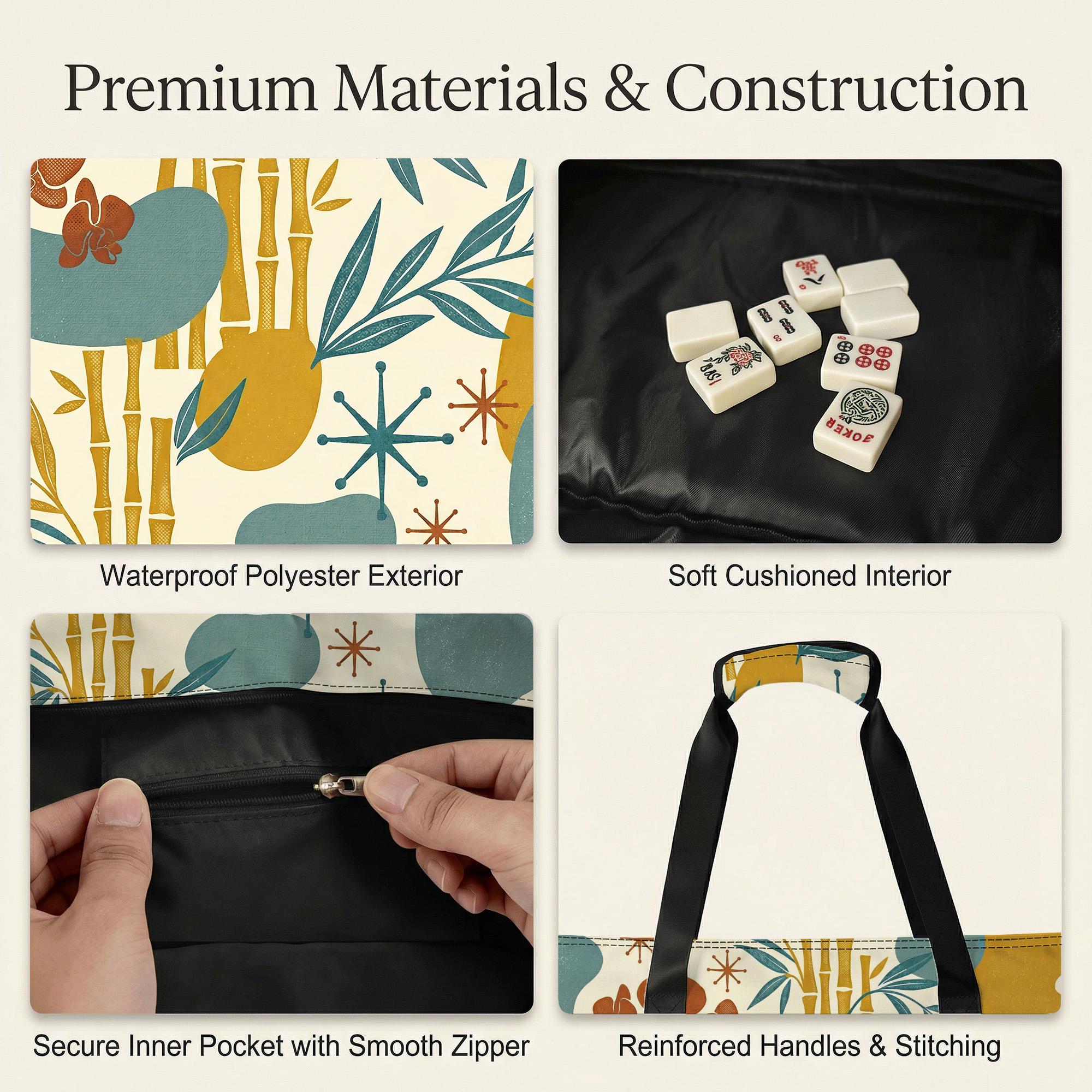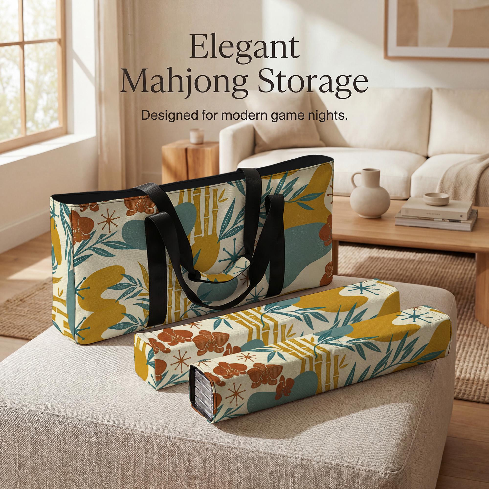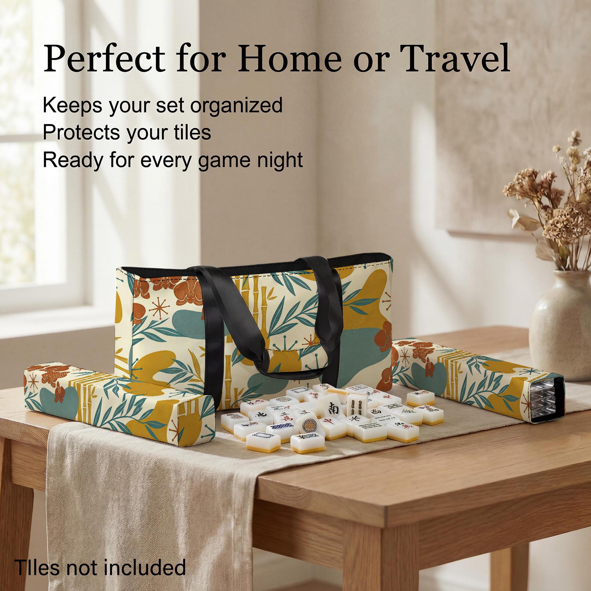 Keep your game night organized with this elegant yellow bamboo and orchid mahjong travel set featuring a waterproof outer bag and protective storage sleeves for tiles and racks. The soft cushioned interior and reinforced handles ensure your full standard set travels safely while the vibrant floral design adds a touch of luxury to every session.