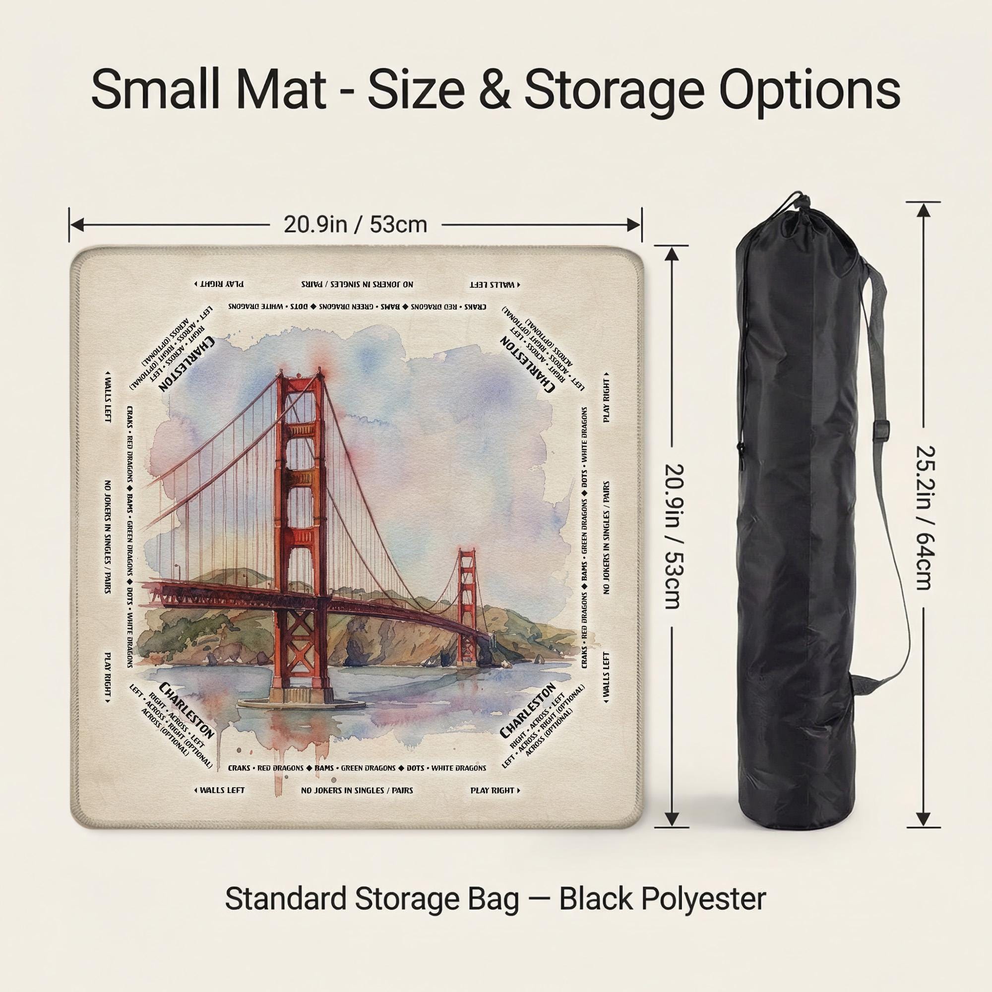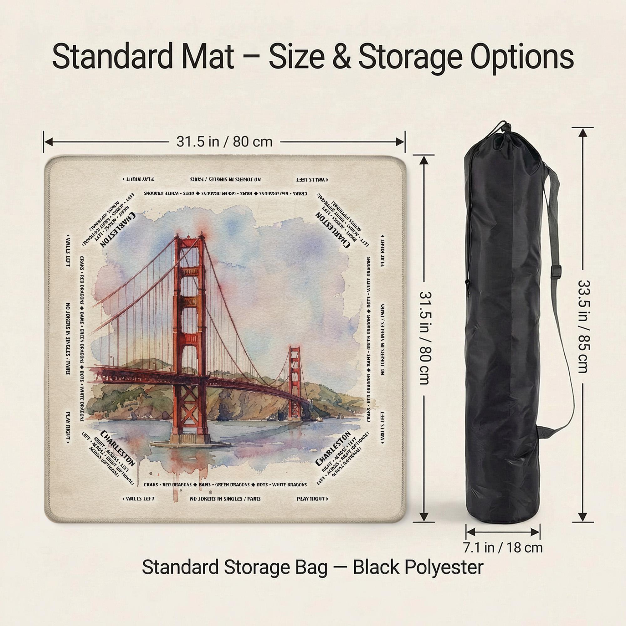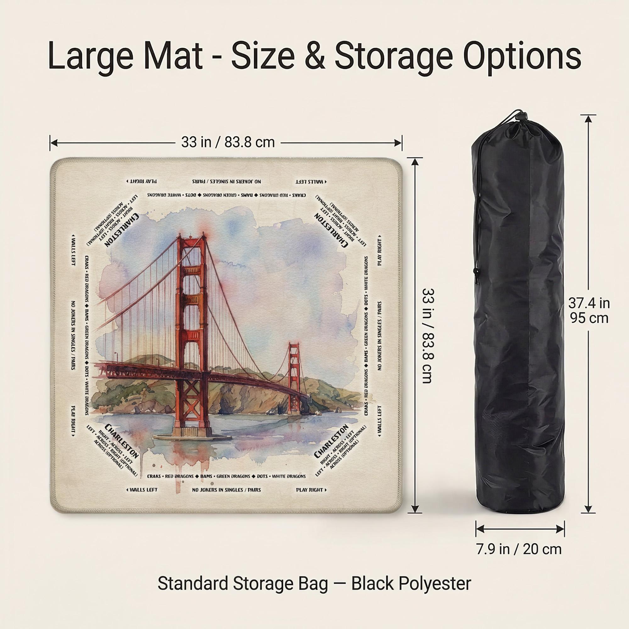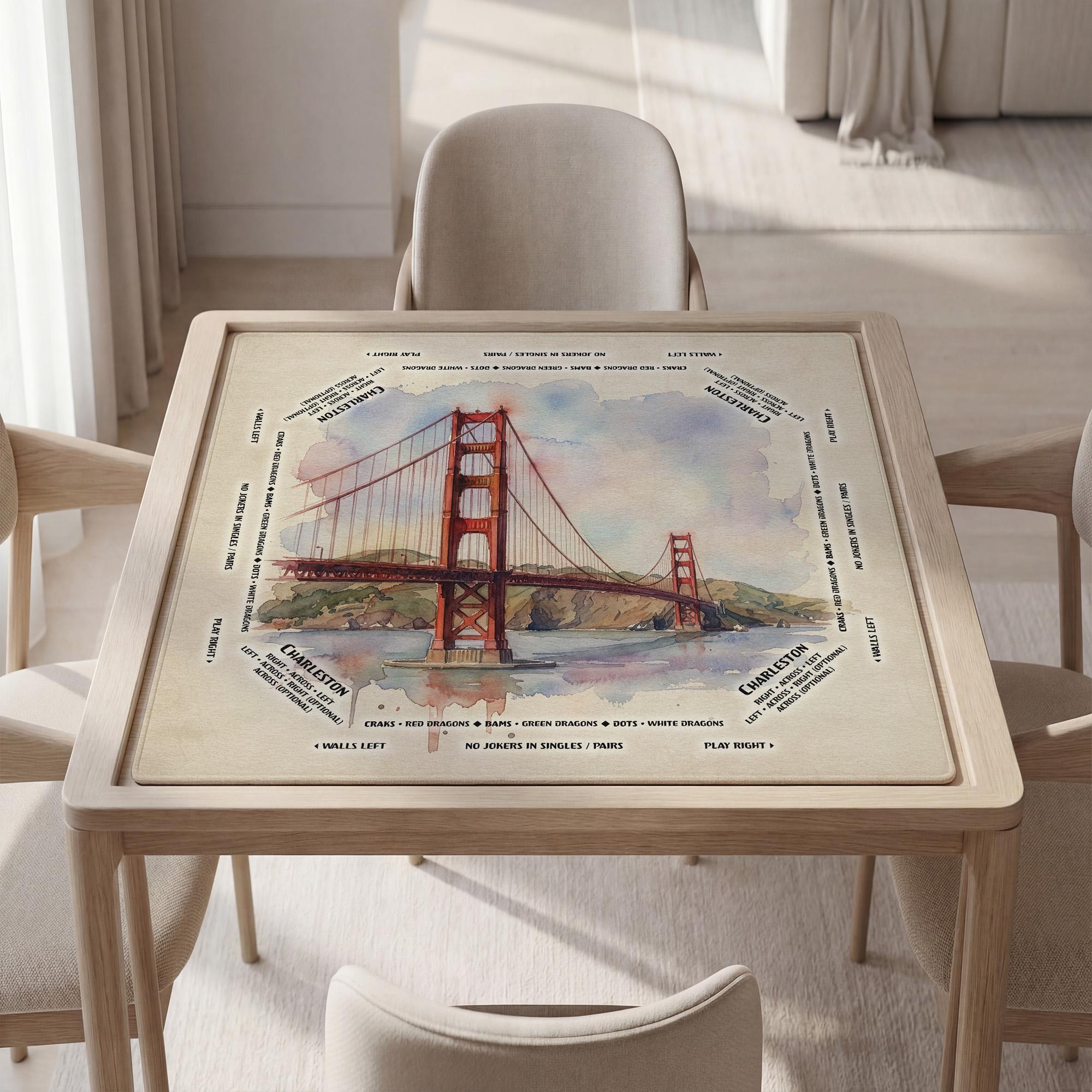 Elevate your game night with this stunning watercolor San Francisco bridge mat designed for American Mahjong players. This waterproof, noise-reducing table cover features integrated Charleston guides and customizable text for a truly unique gaming experience.