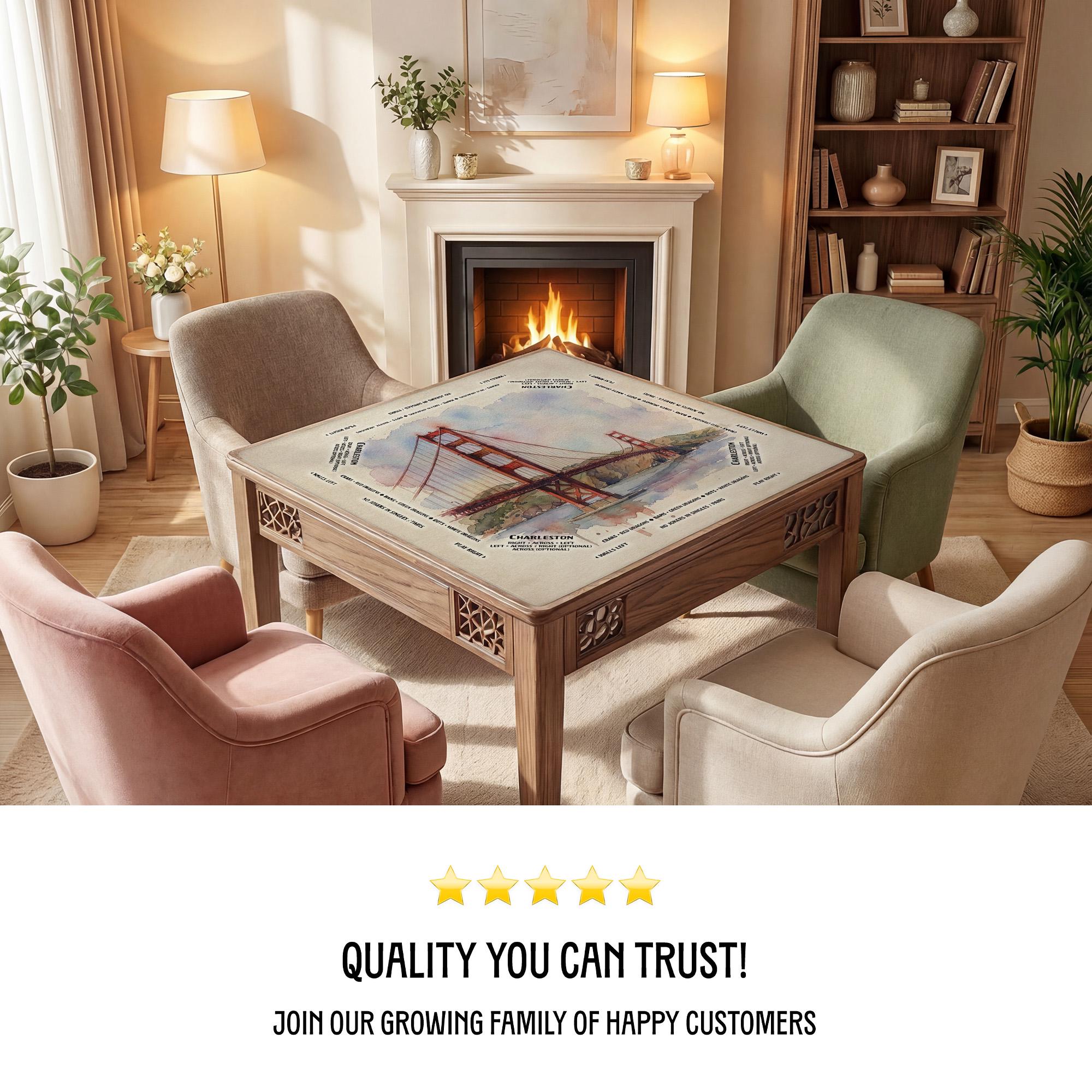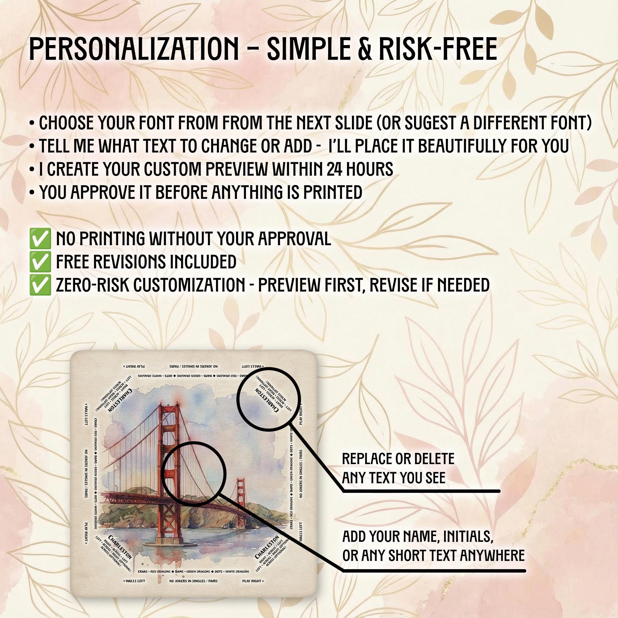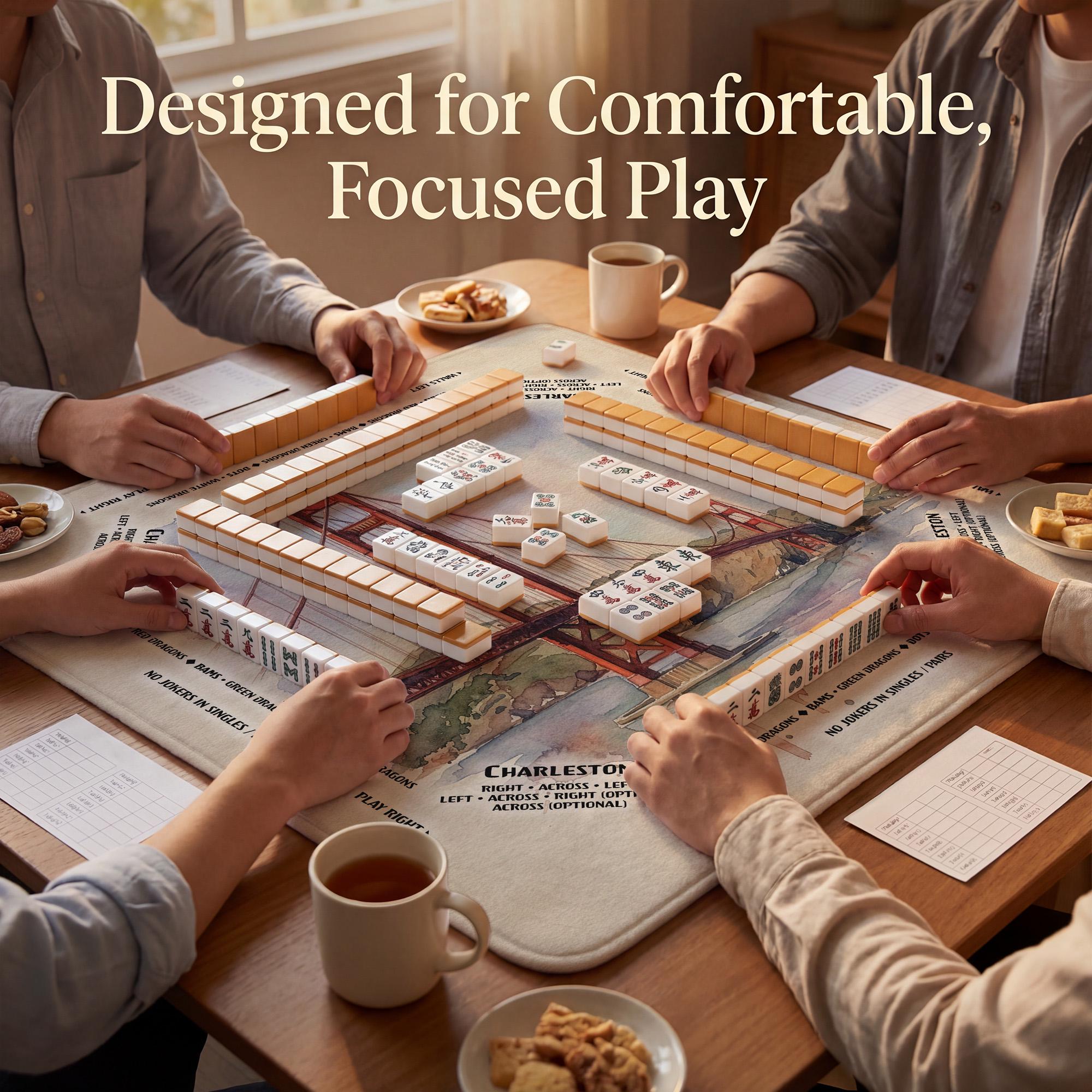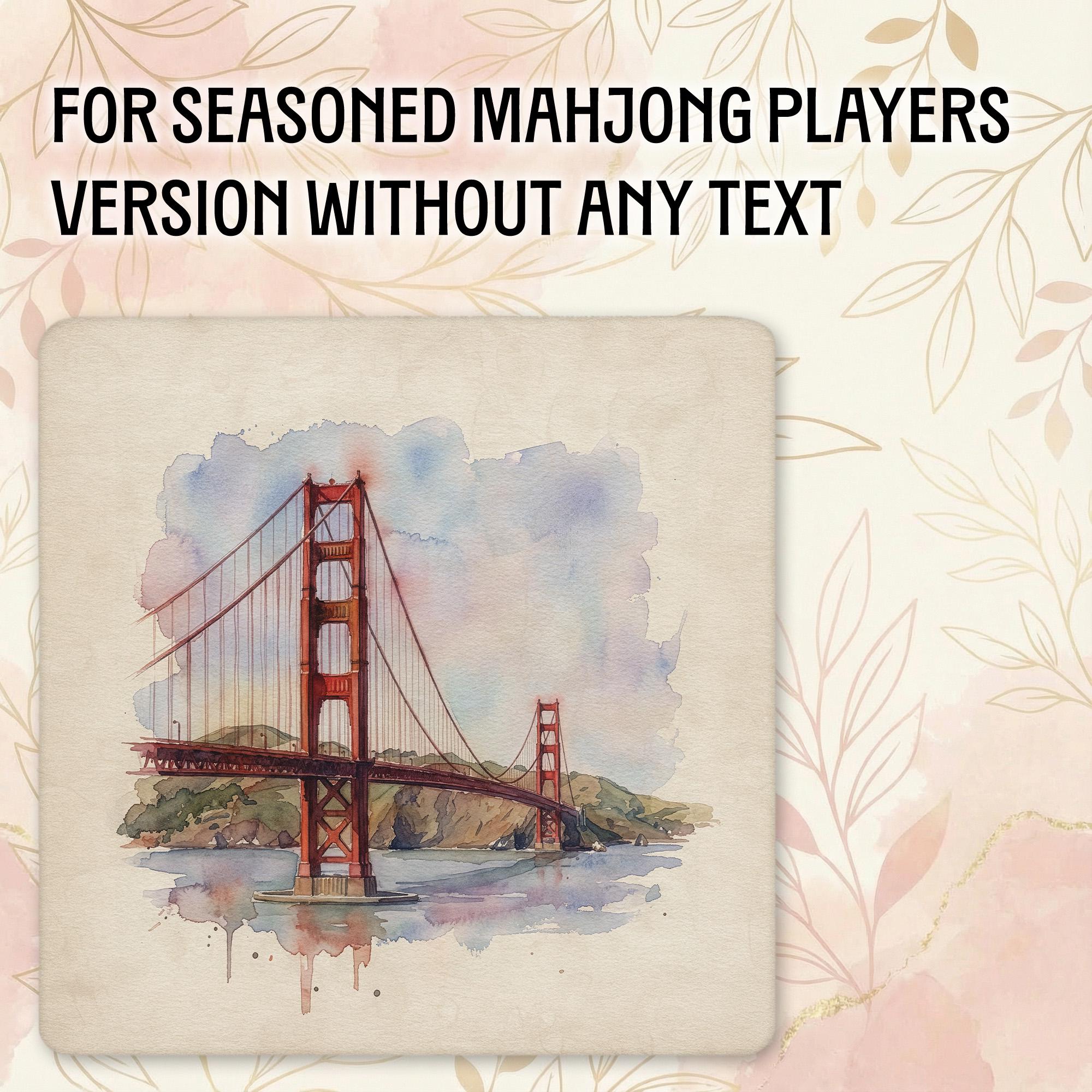 Elevate your game night with this stunning watercolor San Francisco bridge mat designed for American Mahjong players. This waterproof, noise-reducing table cover features integrated Charleston guides and customizable text for a truly unique gaming experience.