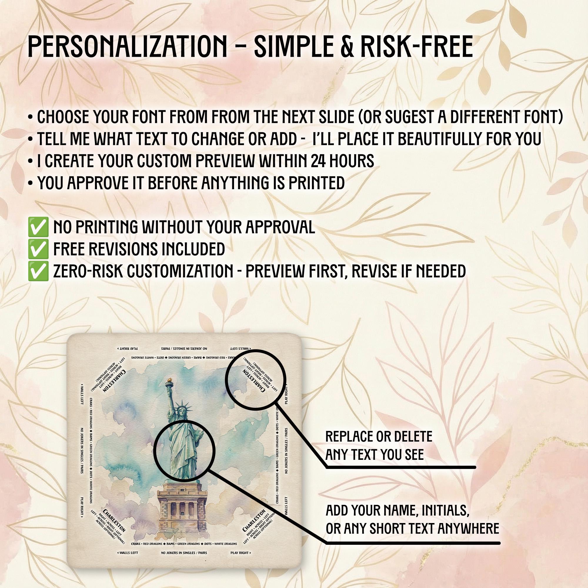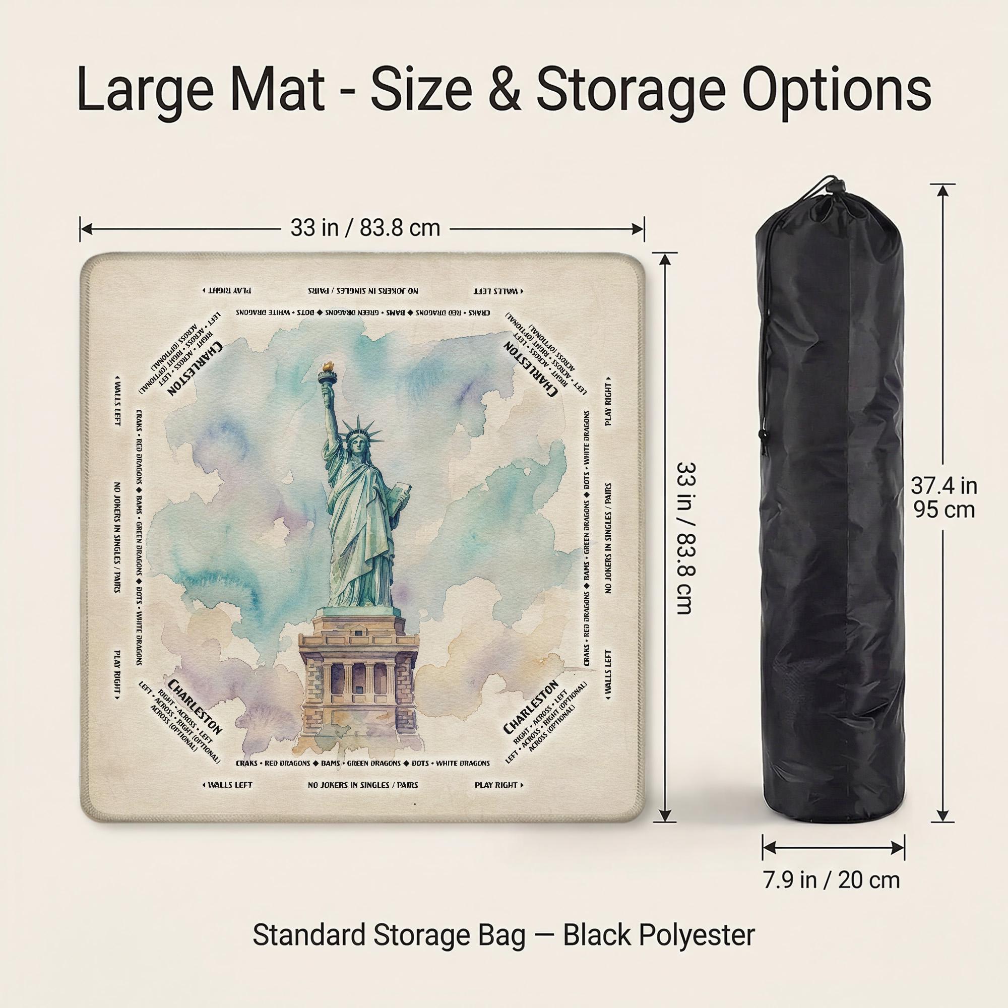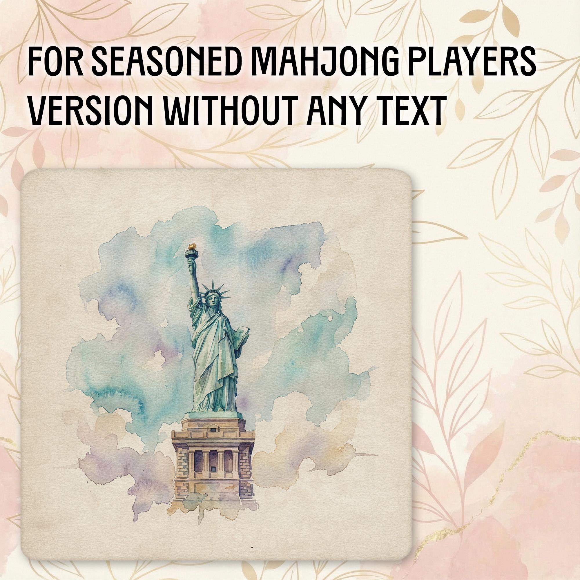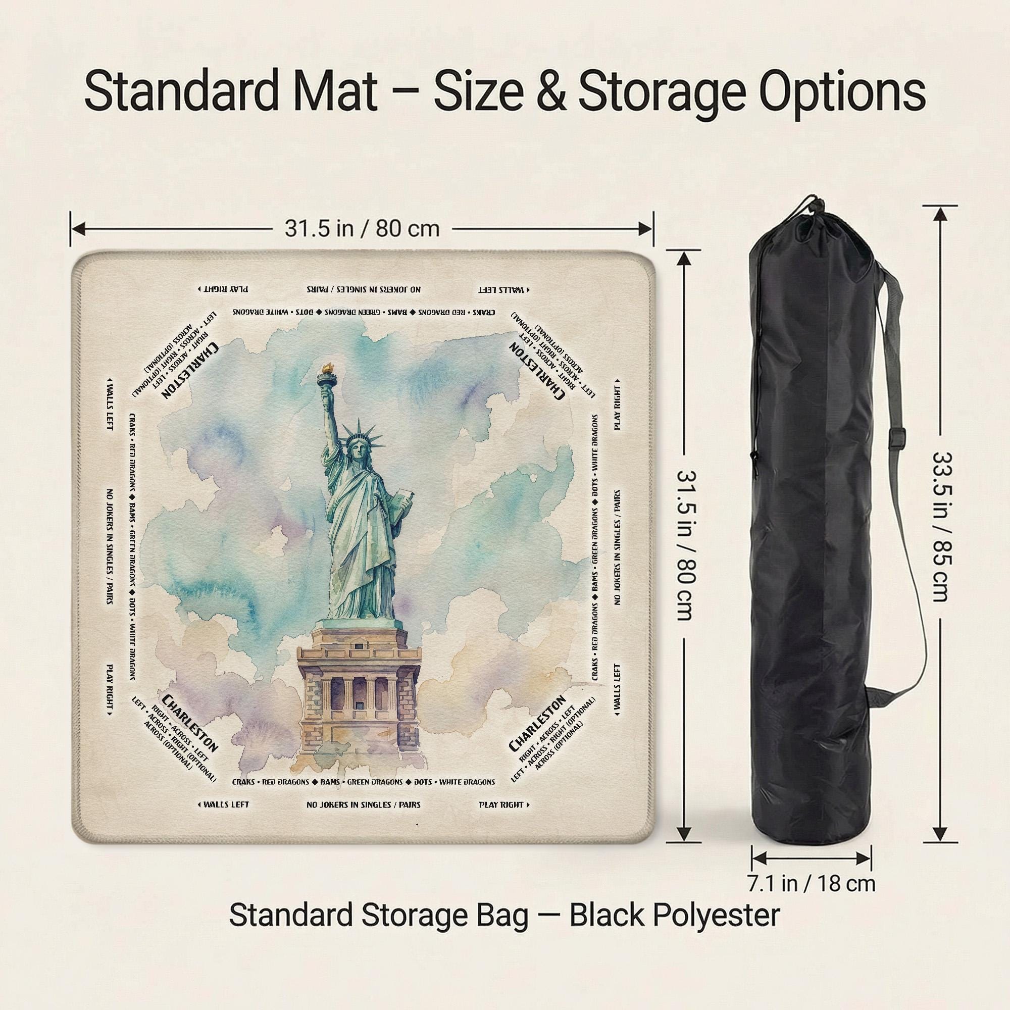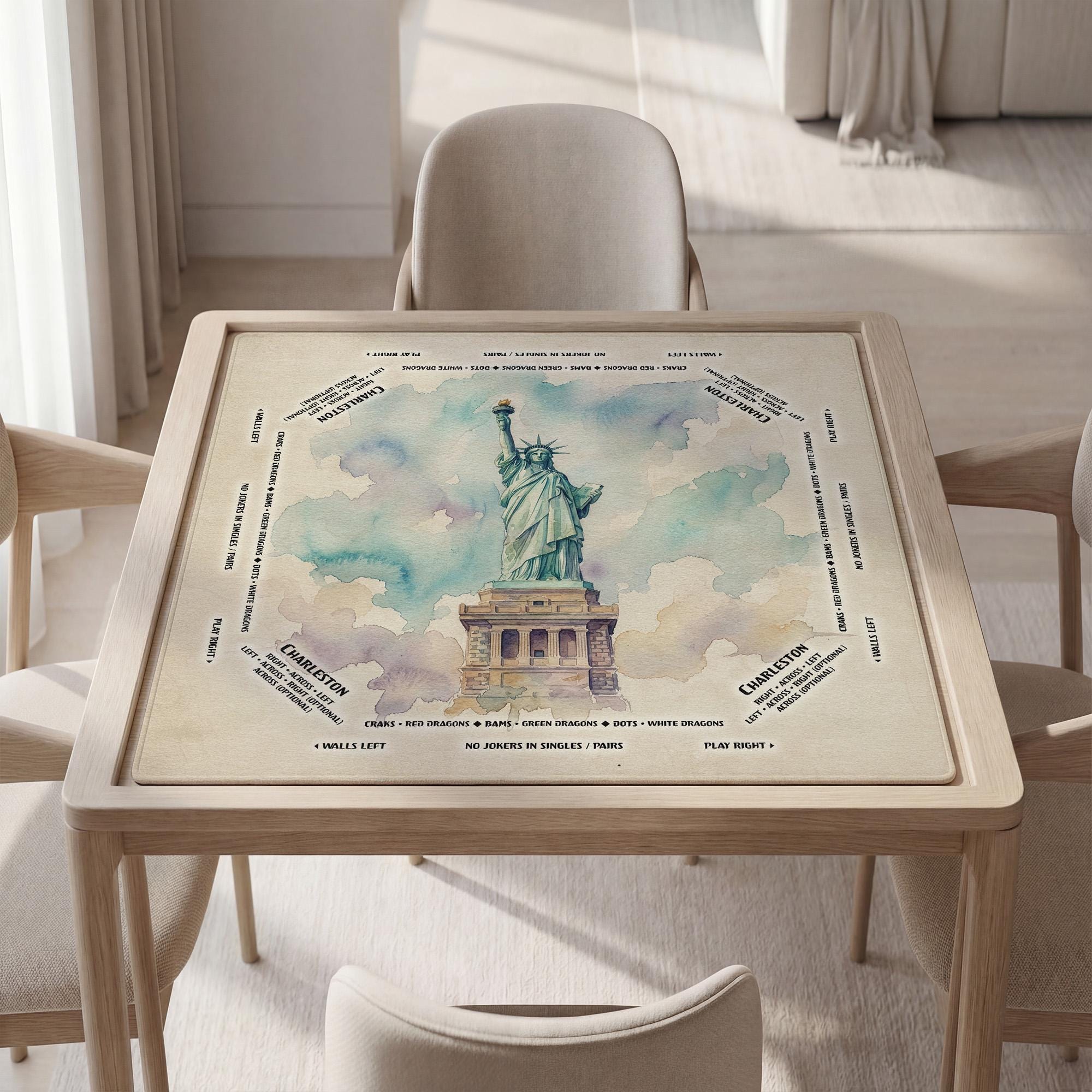 This stunning watercolor Statue of Liberty mat features integrated Charleston guides and a premium waterproof surface to enhance your American Mahjong games. Personalize this cushioned New York City themed table cover with your name or initials for a unique and stylish social gaming experience.