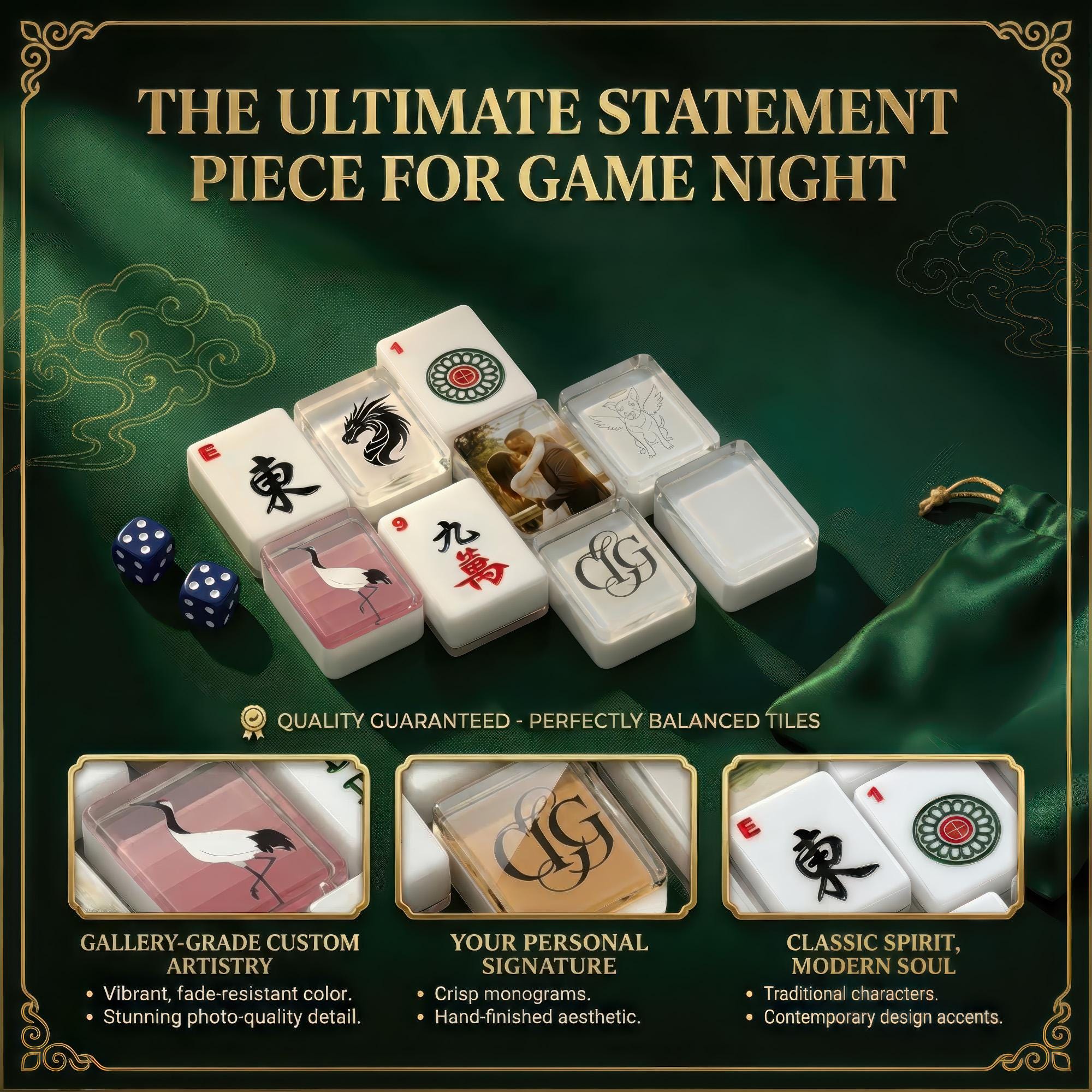 Experience a truly personalized game night with this custom mahjong set, where every tile tells your unique story. Crafted with precision using high definition UV printing on durable acrylic, these personalized tiles bring vibrant artwork and cherished memories to life. Perfect for mahjong lovers seeking a bespoke mahjong kit that doubles as a family keepsake gift or striking social decor.